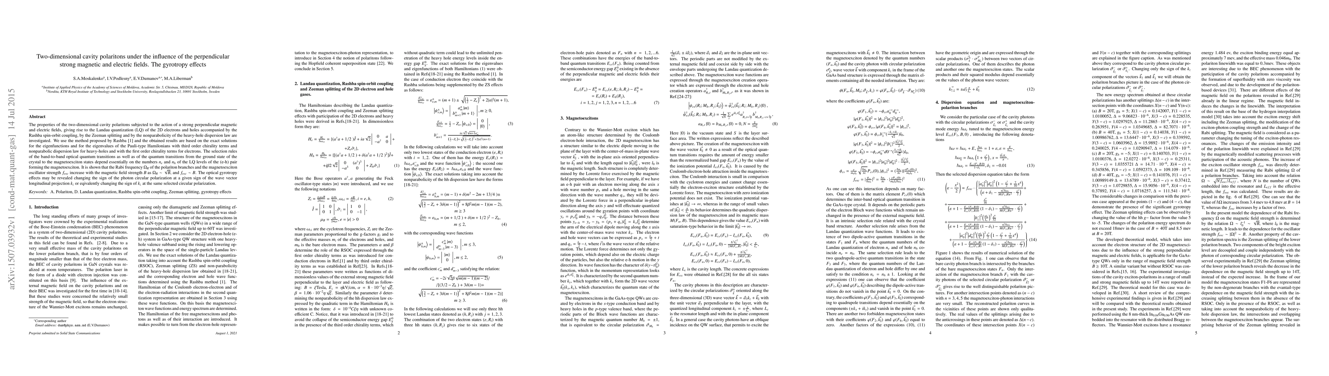 The properties of the two-dimensional cavity polaritons subjected to the action of a strong perpendicular magnetic and electric fields, giving rise to the Landau quantization (LQ) of the 2D electrons and holes accompanied by the Rashba spin-orbit coupling, by the Zeeman splitting and by the nonparabolicity of the heavy-hole dispersion law are investigated. We use the method proposed by Rashba [1] and the obtained results are based on the exact solutions for the eigenfunctions and for the eigenvalues of the Pauli-type Hamilonians with third order chirality terms and nonparabolic dispersion law for heavy-holes and with the first order chirality terms for electrons. The selection rules of the band-to-band optical quantum transitions as well as of the quantum transitions from the ground state of the crystal to the magnetoexciton states depend essentially on the numbers $n_{e}$ and $n_{h}$ of the LQ levels of the (e-h) pair forming the magnetoexciton. It is shown that the Rabi frequency $\Omega_{R}$ of the polariton branches and the magnetoexciton oscillator strength $f_{osc}$ increase with the magnetic field strength $B$ as $\Omega_{R}\sim \sqrt{B}$, and $f_{osc}\sim B$. The optical gyrotropy effects may be revealed changing the sign of the photon circular polarization at a given sign of the wave vector longitudinal projection $k_{z}$ or eqivalently changing the sign of $k_{z}$ at the same selected circular polarization.