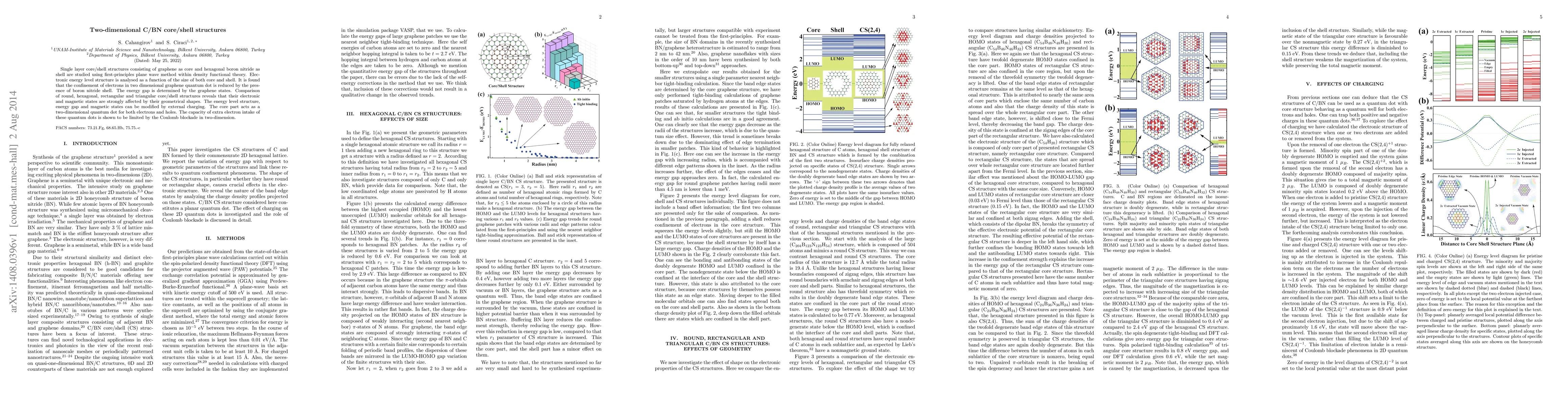 Single layer core/shell structures consisting of graphene as core and hexagonal boron nitride as shell are studied using first-principles plane wave method within density functional theory. Electronic energy level structure is analysed as a function of the size of both core and shell. It is found that the confinement of electrons in two dimensional graphene quantum dot is reduced by the presence of boron nitride shell. The energy gap is determined by the graphene states. Comparison of round, hexagonal, rectangular and triangular core/shell structures reveals that their electronic and magnetic states are strongly affected by their geometrical shapes. The energy level structure, energy gap and magnetic states can be modified by external charging. The core part acts as a two-dimensional quantum dot for both electrons and holes. The capacity of extra electron intake of these quantum dots is shown to be limited by the Coulomb blockade in two-dimension.