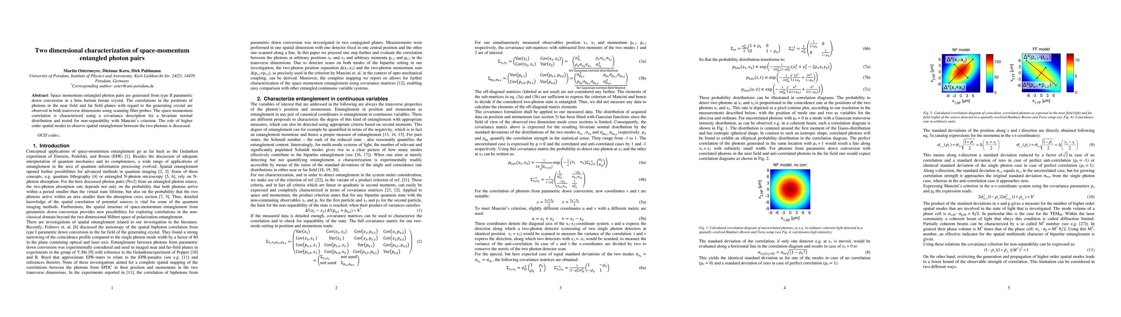 Space momentum entangled photon pairs are generated from type II parametric down conversion in a beta barium borate crystal. The correlations in the positions of photons in the near field and far field planes with regard to the generating crystal are observed in both transverse dimensions using scanning fiber probes. The space-momentum correlation is characterized using a covariance description for a bivariate normal distribution and tested for non-separability with Mancini's criterion. The role of higher order spatial modes to observe spatial entanglement between the two photons is discussed.