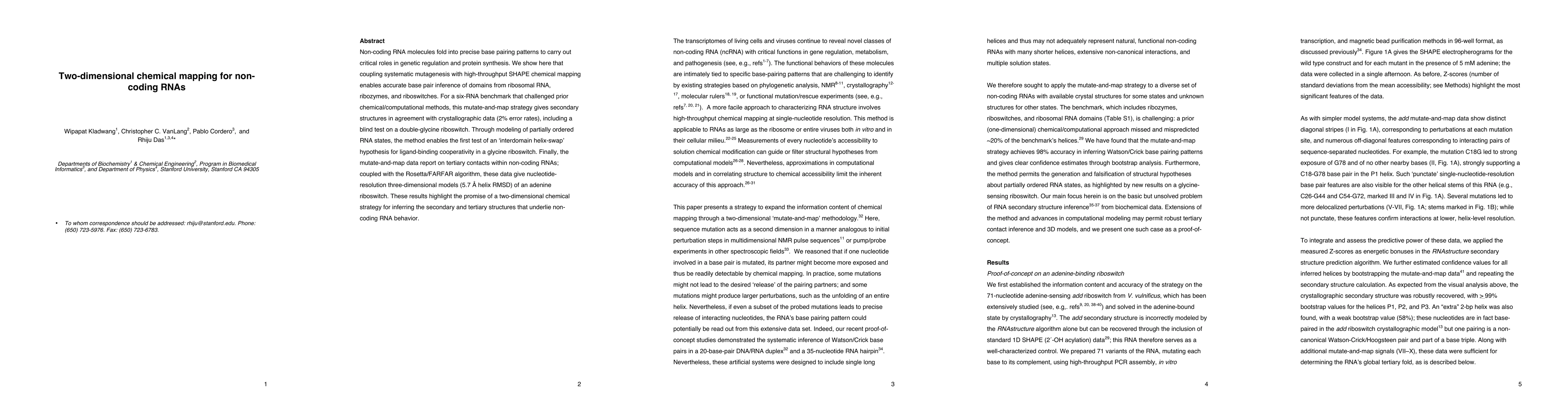 This paper demonstrates a novel method combining systematic mutagenesis with high-throughput SHAPE chemical mapping to accurately infer secondary structures of non-coding RNAs, achieving high agreement with crystallographic data. The approach also tests an 'interdomain helix-swap' hypothesis and provides tertiary contacts, leading to precise three-dimensional RNA models.
