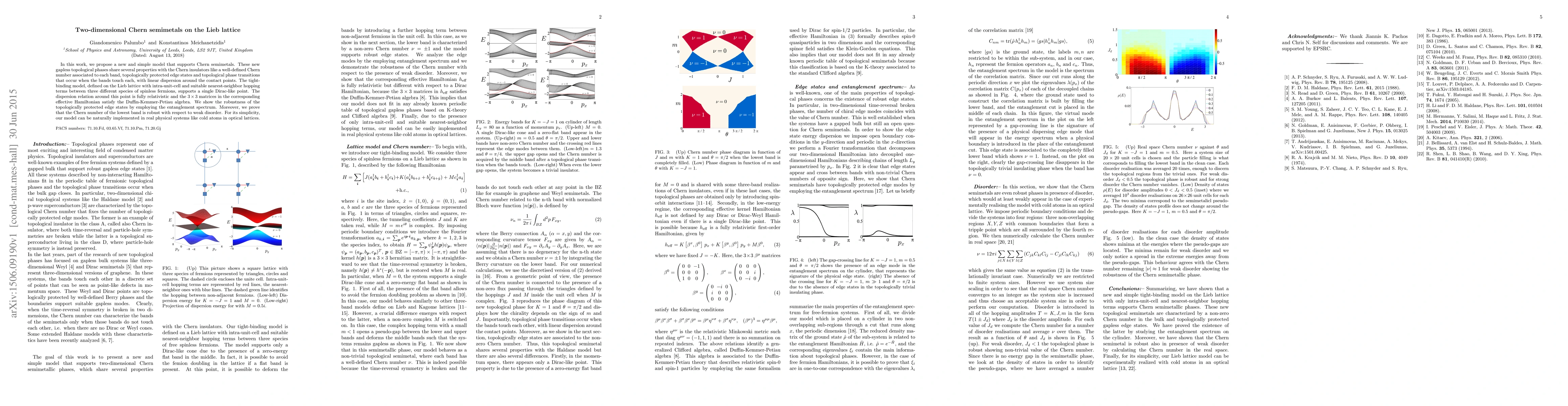 In this work, we propose a new and simple model that supports Chern semimetals. These new gapless topological phases share several properties with the Chern insulators like a well-defined Chern number associated to each band, topologically protected edge states and topological phase transitions that occur when the bands touch each, with linear dispersion around the contact points. The tight-binding model, defined on the Lieb lattice with intra-unit-cell and suitable nearest-neighbor hopping terms between three different species of spinless fermions, supports a single Dirac-like point. The dispersion relation around this point is fully relativistic and the $3\times3$ matrices in the corresponding effective Hamiltonian satisfy the Duffin-Kemmer-Petiau algebra. We show the robustness of the topologically protected edge states by employing the entanglement spectrum. Moreover, we prove that the Chern number of the lowest band is robust with respect to weak disorder. For its simplicity, our model can be naturally implemented in real physical systems like cold atoms in optical lattices.