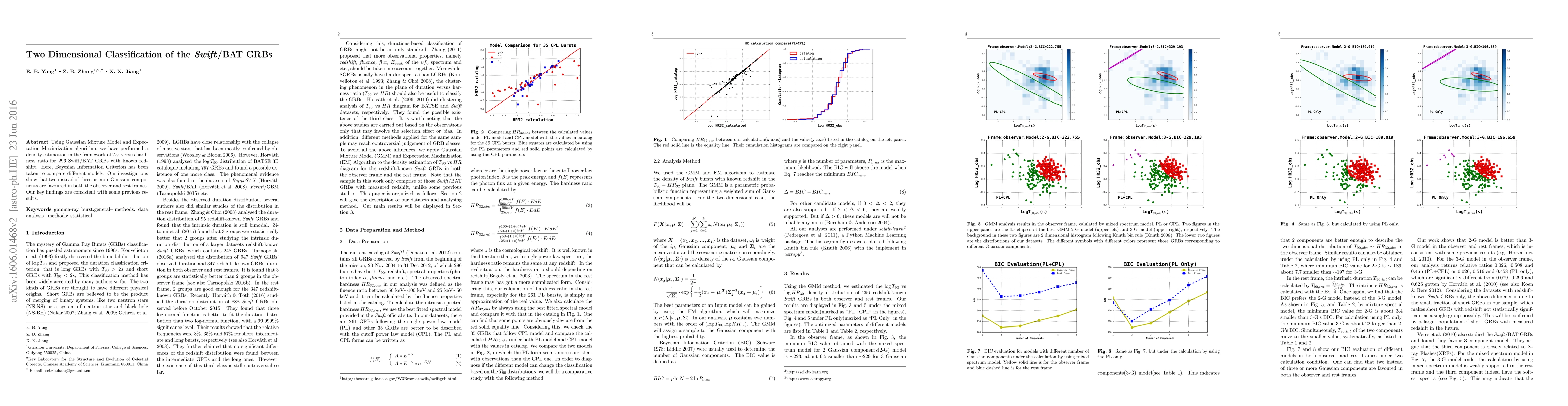 This paper employs a Gaussian Mixture Model and Expectation Maximization to classify 296 Swift/BAT GRBs based on $T_{90}$ versus hardness ratio. The analysis favors a two-component model over three or more, consistent with previous findings.