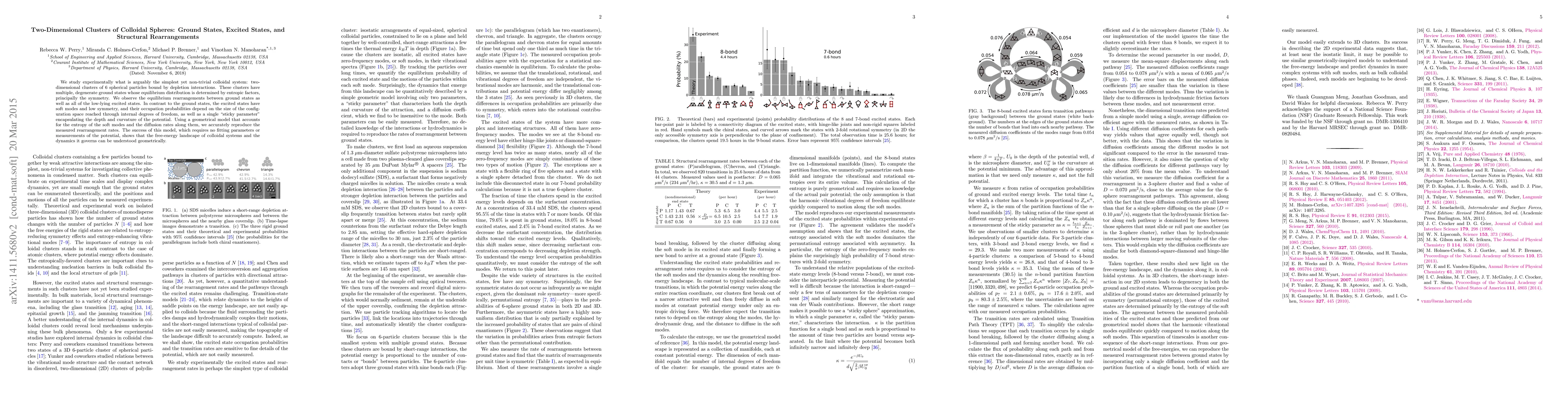 This paper experimentally investigates two-dimensional clusters of six colloidal spheres, revealing multiple degenerate ground states determined by symmetry and entropy. It also explores low-lying excited states characterized by soft modes and low symmetry, and demonstrates a geometrical model that accurately predicts the rearrangement rates without fitting parameters.