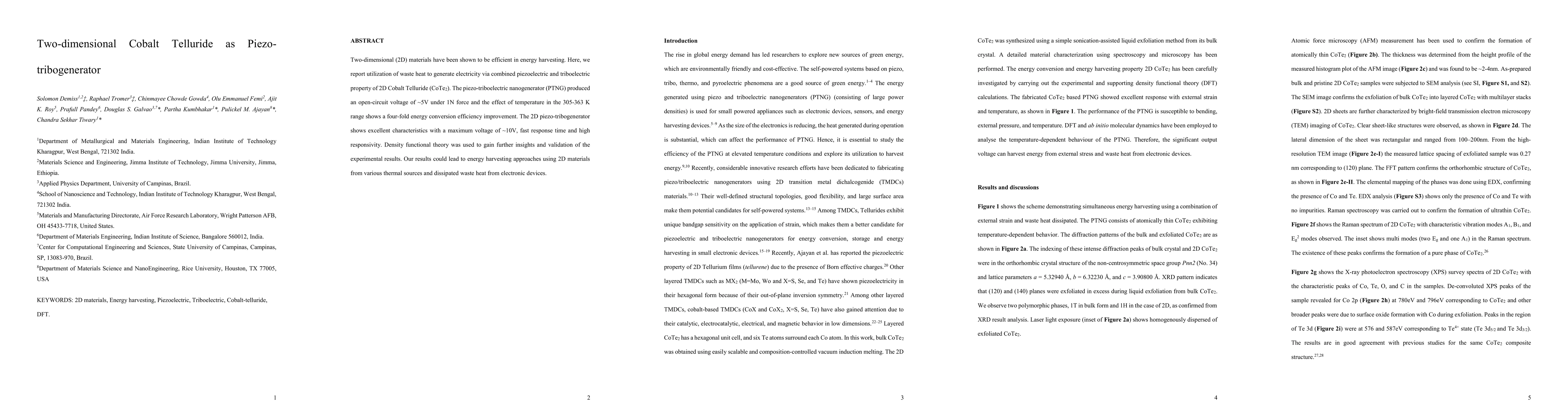 Researchers developed a 2D material-based piezo-tribogenerator that converts waste heat into electricity with improved efficiency. The device achieved an open-circuit voltage of ~5V and demonstrated excellent characteristics for energy harvesting from various thermal sources.