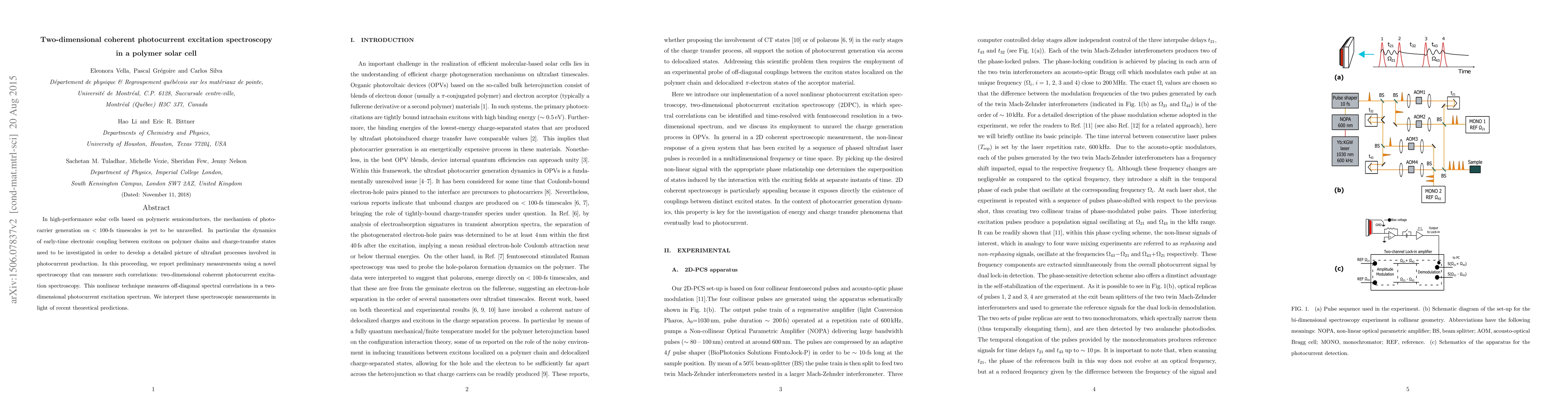 In high-performance solar cells based on polymeric semiconductors, the mechanism of photocarrier generation on $<100$-fs timescales is yet to be unravelled. In particular the dynamics of early-time electronic coupling between excitons on polymer chains and charge-transfer states need to be investigated in order to develop a detailed picture of ultrafast processes involved in photocurrent production. In this proceeding, we report preliminary measurements using a novel spectroscopy that can measure such correlations: two-dimensional coherent photocurrent excitation spectroscopy. This nonlinear technique measures off-diagonal spectral correlations in a two-dimensional photocurrent excitation spectrum. We interpret these sectroscopic measurements in light of recent theoretical predictions.
