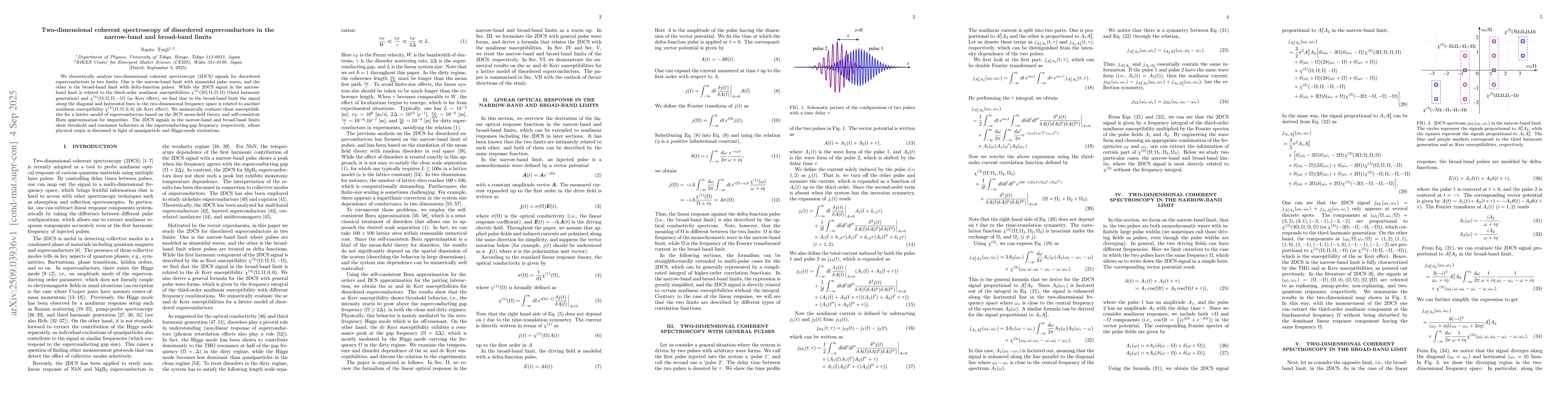 We theoretically analyze two-dimensional coherent spectroscopy (2DCS) signals for disordered superconductors in two limits: One is the narrow-band limit with sinusoidal pulse waves, and the other is the broad-band limit with delta-function pulses. While the 2DCS signal in the narrow-band limit is related to the third-order nonlinear susceptibilities $\chi^{(3)}(3\Omega; \Omega, \Omega, \Omega)$ (third harmonic generation) and $\chi^{(3)}(\Omega; \Omega, \Omega, -\Omega)$ (ac Kerr effect), we find that in the broad-band limit the signal along the diagonal and horizontal lines in the two-dimensional frequency space is related to another nonlinear susceptibility $\chi^{(3)}(\Omega; \Omega, 0, 0)$ (dc Kerr effect). We numerically evaluate those susceptibilities for a lattice model of superconductors based on the BCS mean-field theory and self-consistent Born approximation for impurities. The 2DCS signals in the narrow-band and broad-band limits show threshold and resonance behaviors at the superconducting-gap frequency, respectively, whose physical origin is discussed in light of quasiparticle and Higgs-mode excitations.