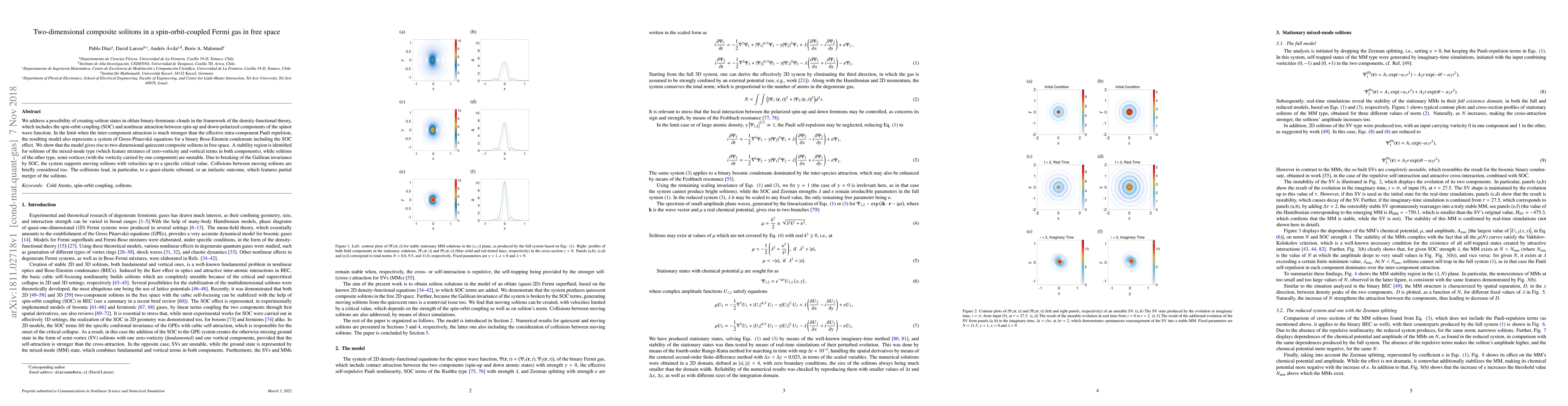 We address a possibility of creating soliton states in oblate binary-fermionic clouds in the framework of the density-functional theory, which includes the spin-orbit coupling (SOC) and nonlinear attraction between spin-up and down-polarized components of the spinor wave function. In the limit when the inter-component attraction is much stronger than the effective intra-component Pauli repulsion, the resulting model also represents a system of Gross-Pitaevskii equations for a binary Bose-Einstein condensate including the SOC effect. We show that the model gives rise to two-dimensional quiescent composite solitons in free space. A stability region is identified for solitons of the mixed-mode type (which feature mixtures of zero-vorticity and vortical terms in both components), while solitons of the other type, semi-vortices (with the vorticity carried by one component) are unstable. Due to breaking of the Galilean invariance by SOC, the system supports moving solitons with velocities up to a specific critical value. Collisions between moving solitons are briefly considered too. The collisions lead, in particular, to a quasi-elastic rebound, or an inelastic outcome, which features partial merger of the solitons.