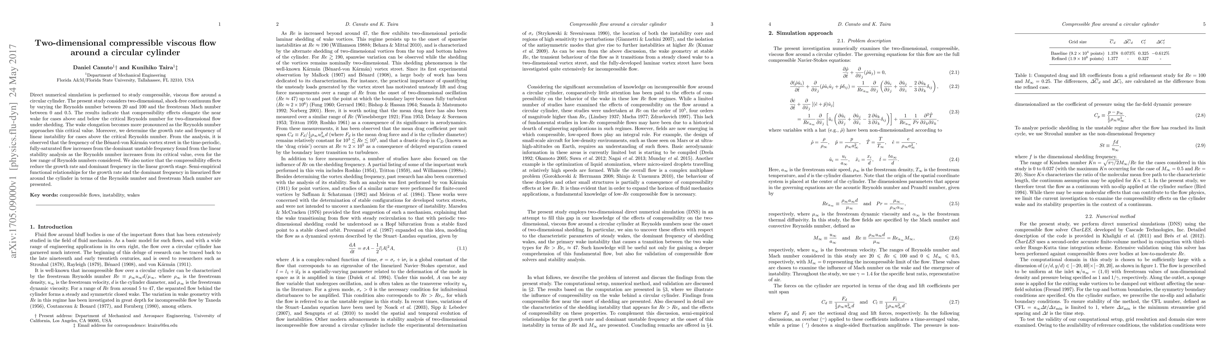 This study uses direct numerical simulation to analyze compressible, viscous flow around a circular cylinder at low Mach numbers, finding that compressibility elongates the near wake and alters the vortex shedding frequency, especially near the critical Reynolds number for two-dimensional flow. Semi-empirical relationships for growth rate and dominant frequency are derived.