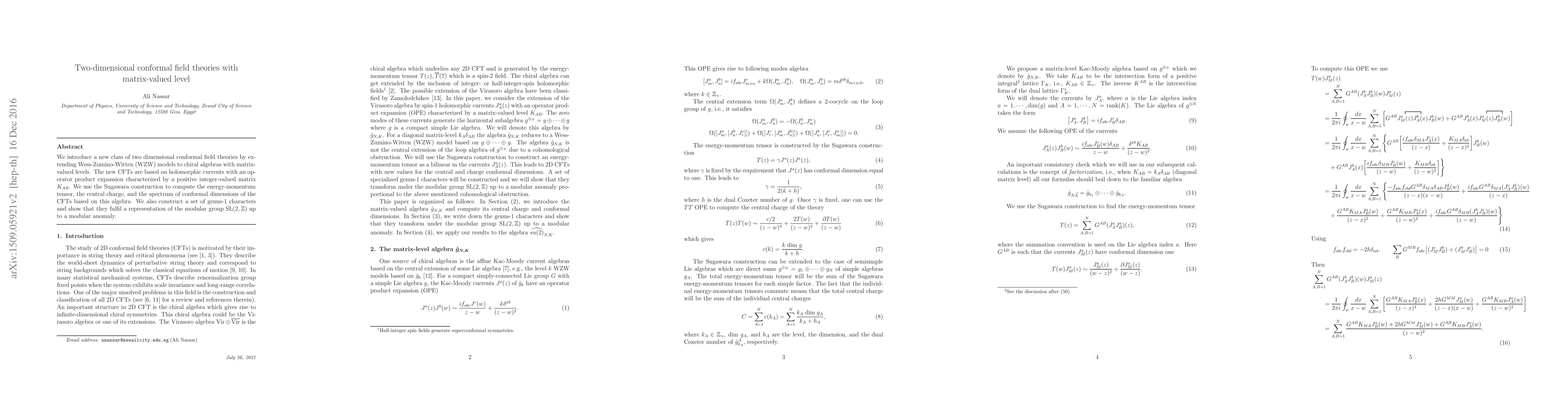 We introduce a new class of two dimensional conformal field theories by extending Wess-Zumino-Witten (WZW) models to chiral algebras with matrix-valued levels. The new CFTs are based on holomorphic currents with an operator product expansion characterized by a positive integer-valued matrix $K_{AB}$. We use the Sugawara construction to compute the energy-momentum tensor, the central charge, and the spectrum of conformal dimensions of the CFTs based on this algebra. We also construct a set of genus-$1$ characters and show that they fulfil a representation of the modular group $\text{SL}(2,\mathbb{Z})$ up to a modular anomaly.