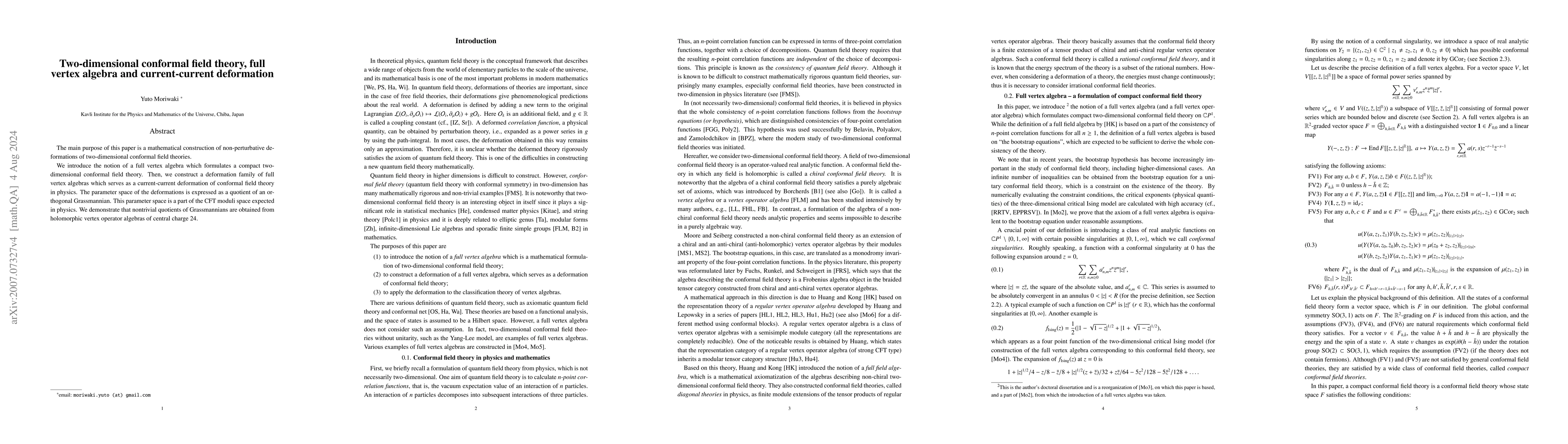 This paper constructs a non-perturbative deformation of two-dimensional conformal field theory using full vertex algebras and explores its parameter space as a double coset of an orthogonal group. It also provides a mass formula for counting isomorphic classes of vertex operator algebras resulting from current-current deformations, demonstrated for a holomorphic vertex operator algebra of central charge 24.