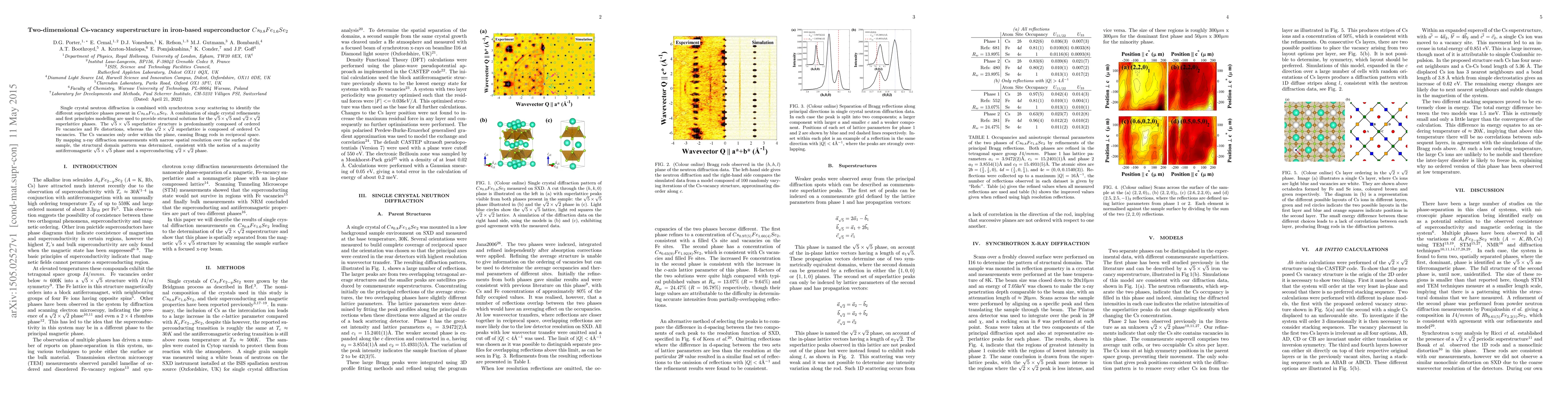 Single crystal neutron diffraction is combined with synchrotron x-ray scattering to identify the different superlattice phases present in $Cs_{0.8}Fe_{1.6}Se_2$. A combination of single crystal refinements and first principles modelling are used to provide structural solutions for the $\sqrt{5}\times\sqrt{5}$ and $\sqrt{2}\times\sqrt{2}$ superlattice phases. The $\sqrt{5}\times\sqrt{5}$ superlattice structure is predominantly composed of ordered Fe vacancies and Fe distortions, whereas the $\sqrt{2}\times\sqrt{2}$ superlattice is composed of ordered Cs vacancies. The Cs vacancies only order within the plane, causing Bragg rods in reciprocal space. By mapping x-ray diffraction measurements with narrow spatial resolution over the surface of the sample, the structural domain pattern was determined, consistent with the notion of a majority antiferromagnetic $\sqrt{5}\times\sqrt{5}$ phase and a superconducting $\sqrt{2}\times\sqrt{2}$ phase.