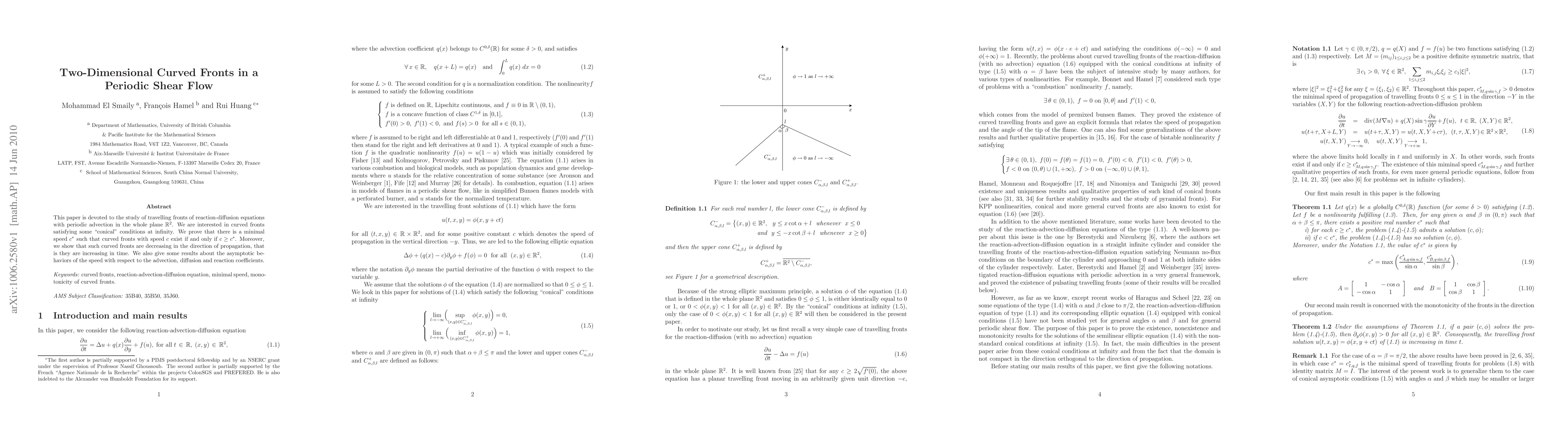 This paper investigates travelling fronts in reaction-diffusion equations with periodic advection, proving the existence of a minimal speed $c^*$ for curved fronts that propagate in a decreasing manner. It also explores the asymptotic behavior of the speed concerning the advection, diffusion, and reaction coefficients.