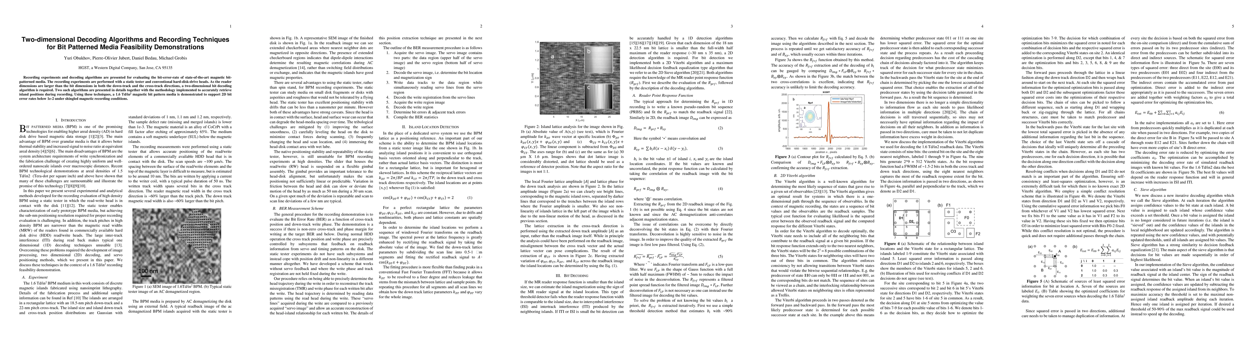 Recording experiments and decoding algorithms are presented for evaluating the bit-error-rate of state-of-the-art magnetic bitpatterned media. The recording experiments are performed with a static tester and conventional hard-disk-drive heads. As the reader dimensions are larger than the bit dimensions in both the down-track and the cross-track directions, a two-dimensional bit decoding algorithm is required. Two such algorithms are presented in details together with the methodology implemented to accurately retrieve island positions during recording. Using these techniques, a 1.6 Td/in$^2$ magnetic bit pattern media is demonstrated to support 2D bit error rates below 1e-2 under shingled magnetic recording conditions.