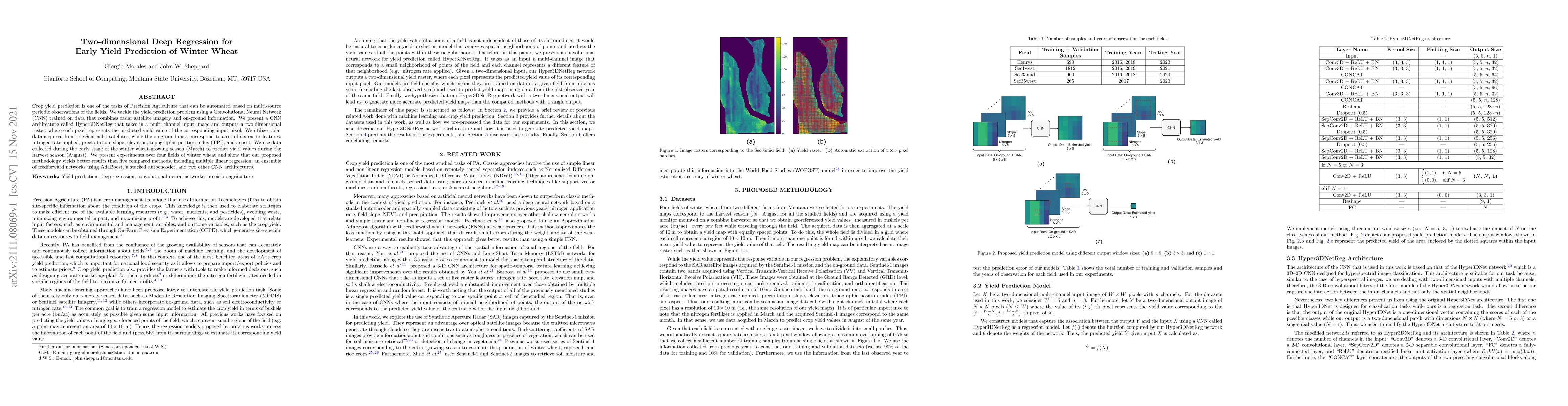 This paper proposes a Convolutional Neural Network (CNN) architecture called Hyper3DNetReg for early yield prediction of winter wheat, combining radar satellite imagery and on-ground features to predict yield values during harvest. The method outperforms several baselines, including linear regression and other neural network architectures.