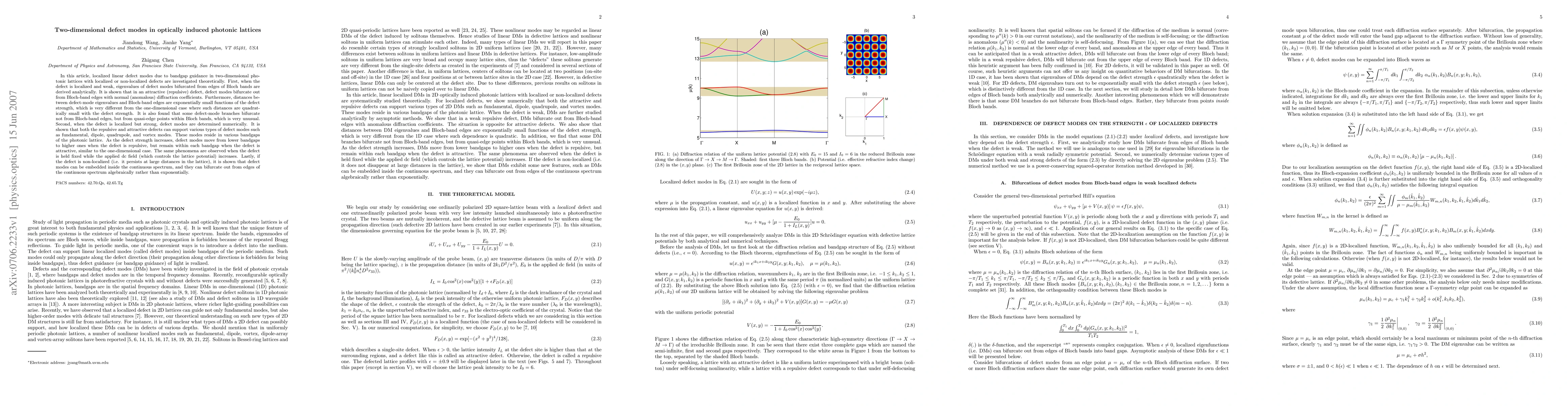 This paper investigates two-dimensional photonic lattices with localized and non-localized defects, analytically and numerically deriving defect modes that bifurcate from Bloch-band edges or quasi-edge points. Strong defects support various defect modes that shift with increasing defect strength, differing from one-dimensional cases.