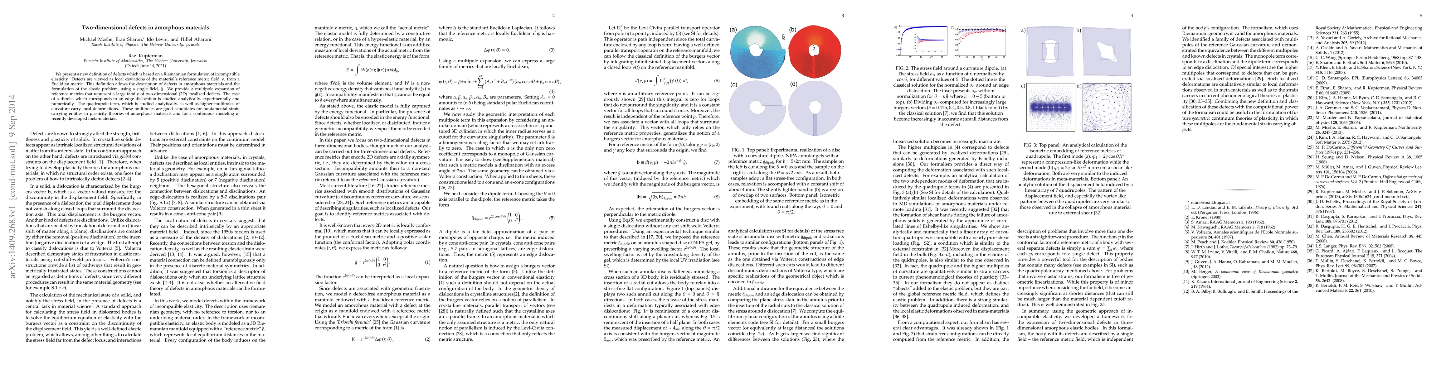 This research introduces a Riemannian approach to define defects in amorphous materials as deviations from a Euclidean metric, using a single reference metric field. It presents multipole expansions for localized 2D defects, analytically, experimentally, and numerically studying dipoles and quadrupoles, which are proposed as fundamental entities in plasticity theories and meta-material modeling.