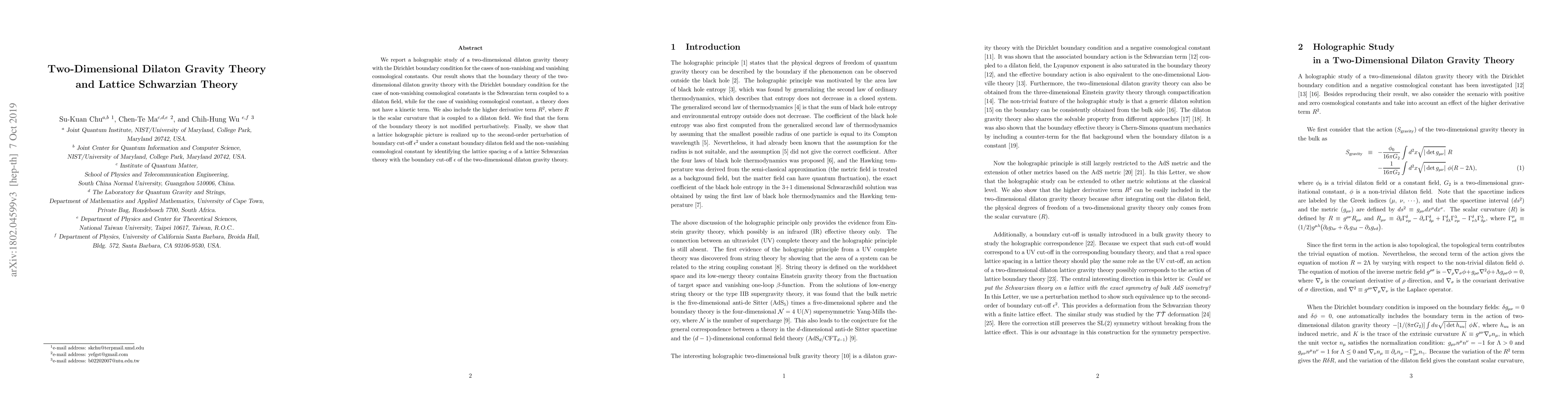 We report a holographic study of a two-dimensional dilaton gravity theory with the Dirichlet boundary condition for the cases of non-vanishing and vanishing cosmological constants. Our result shows that the boundary theory of the two-dimensional dilaton gravity theory with the Dirichlet boundary condition for the case of non-vanishing cosmological constants is the Schwarzian term coupled to a dilaton field, while for the case of vanishing cosmological constant, a theory does not have a kinetic term. We also include the higher derivative term $R^2$, where $R$ is the scalar curvature that is coupled to a dilaton field. We find that the form of the boundary theory is not modified perturbatively. Finally, we show that a lattice holographic picture is realized up to the second-order perturbation of boundary cut-off $\epsilon^2$ under a constant boundary dilaton field and the non-vanishing cosmological constant by identifying the lattice spacing $a$ of a lattice Schwarzian theory with the boundary cut-off $\epsilon$ of the two-dimensional dilaton gravity theory.