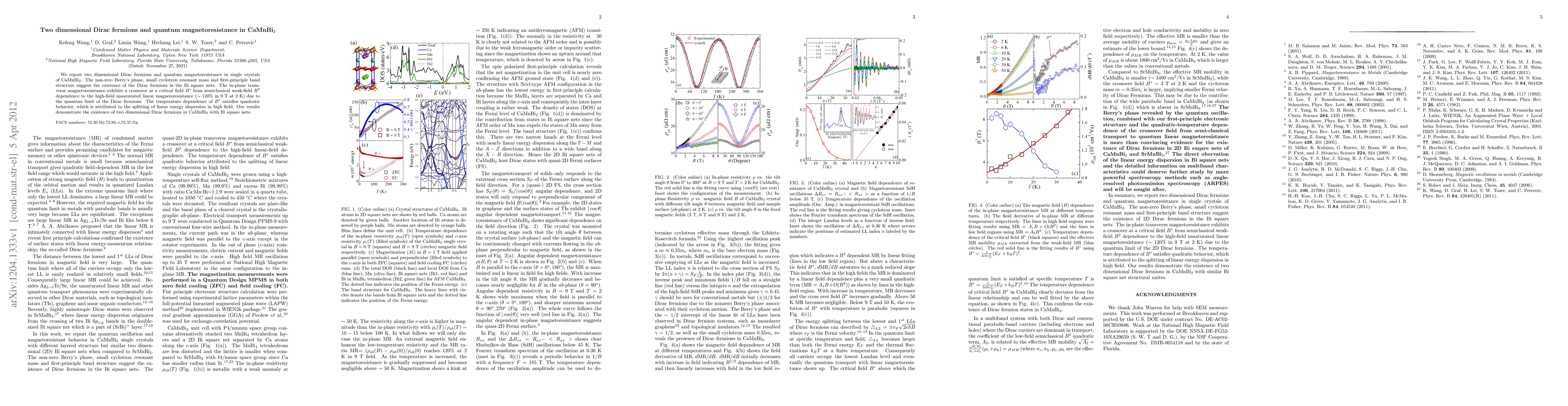 This study identifies two-dimensional Dirac fermions in CaMnBi$_2$ crystals, characterized by a non-zero Berry's phase and small cyclotron mass. It observes quantum magnetoresistance, with a crossover from $B^2$ dependence to linear behavior at a critical field $B^*$, indicating the quantum limit of Dirac fermions in Bi square nets.