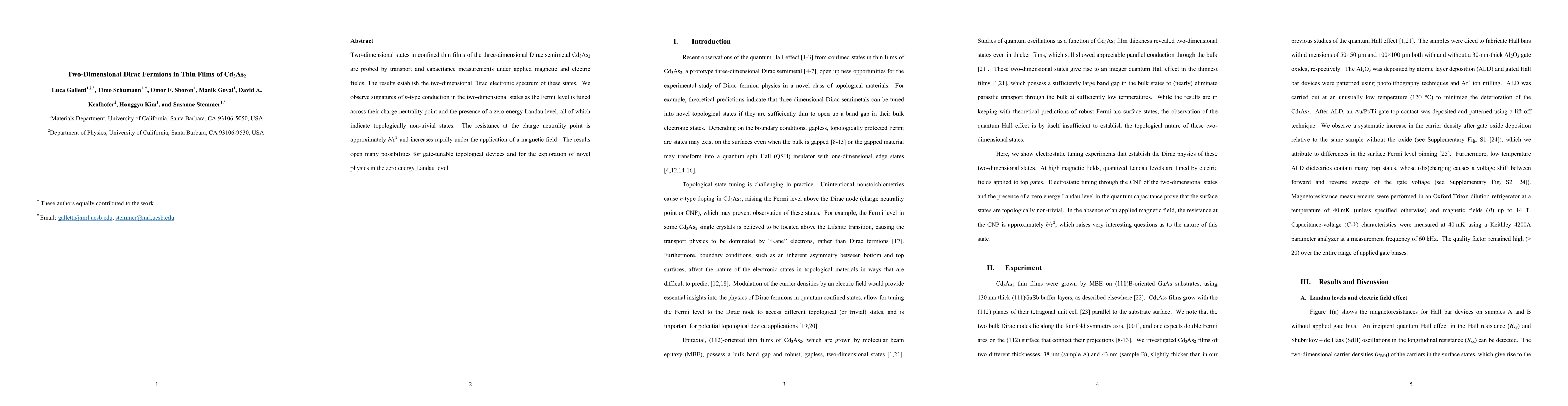 Two-dimensional states in confined thin films of the three-dimensional Dirac semimetal Cd3As2 are probed by transport and capacitance measurements under applied magnetic and electric fields. The results establish the two-dimensional Dirac electronic spectrum of these states. We observe signatures of p-type conduction in the two-dimensional states as the Fermi level is tuned across their charge neutrality point and the presence of a zero energy Landau level, all of which indicate topologically non-trivial states. The resistance at the charge neutrality point is approximately h/e2 and increases rapidly under the application of a magnetic field. The results open many possibilities for gate-tunable topological devices and for the exploration of novel physics in the zero energy Landau level.