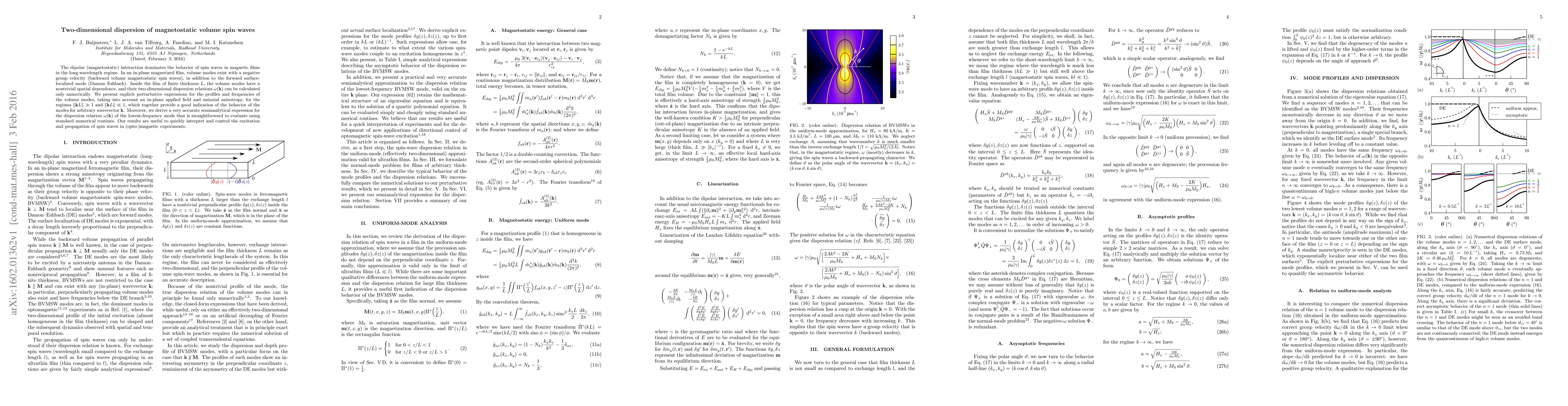 This paper investigates the two-dimensional dispersion relations of magnetostatic volume spin waves in in-plane magnetized magnetic films, providing perturbative expressions for their profiles and frequencies. It also offers a semianalytical expression for the dispersion relation of the lowest-frequency mode, aiding in the interpretation and control of spin wave propagation in magnetic experiments.