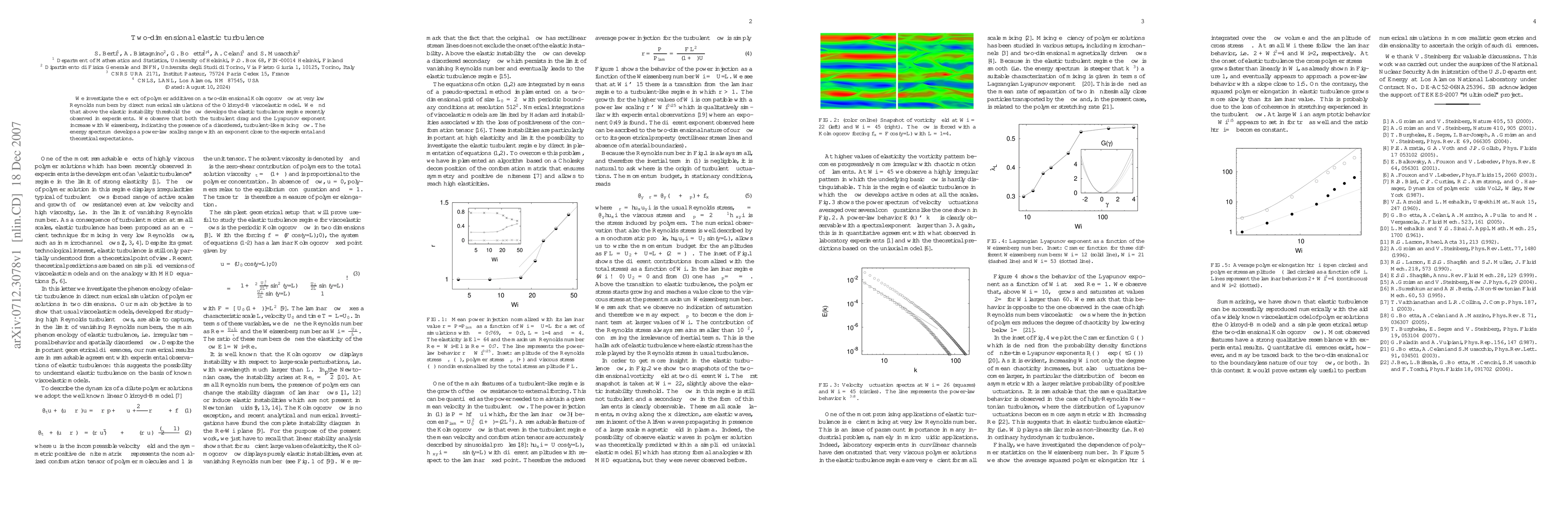 Summary: This study uses direct numerical simulations to explore how polymer additives affect two-dimensional Kolmogorov flow at low Reynolds numbers, revealing the emergence of elastic turbulence above a critical threshold. The turbulent drag and Lyapunov exponent increase with Weissenberg number, indicating a disordered, turbulent-like mixing flow, and the energy spectrum shows a power-law scaling consistent with theoretical predictions.