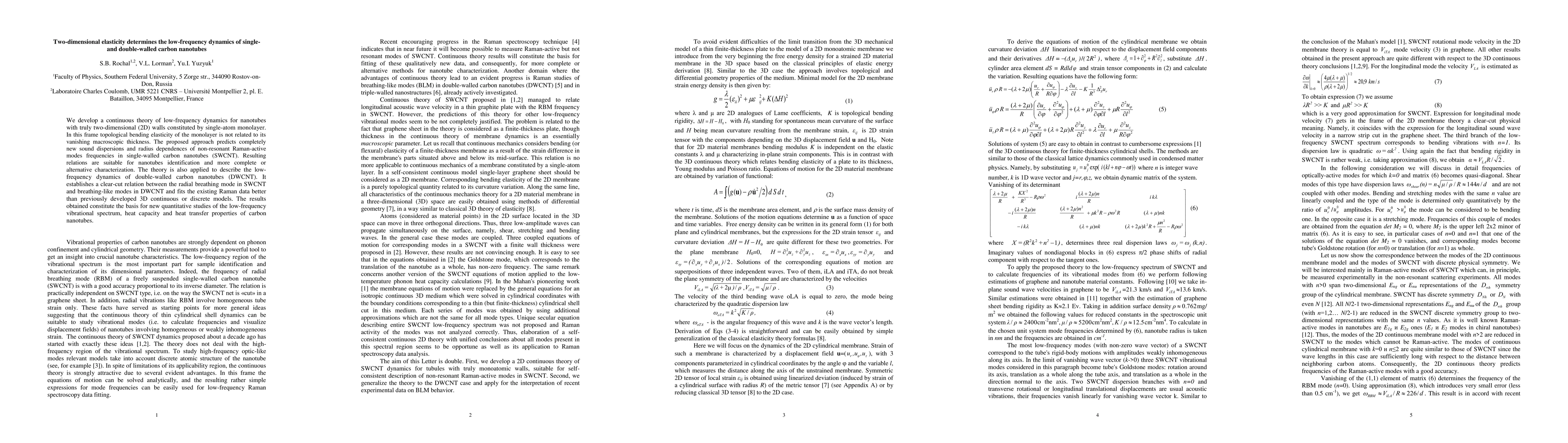 This paper develops a continuous theory for the low-frequency dynamics of single- and double-walled carbon nanotubes, emphasizing two-dimensional elasticity effects. It predicts new sound dispersions and identifies unique Raman-active mode frequencies, providing improved characterization and identification methods for carbon nanotubes.