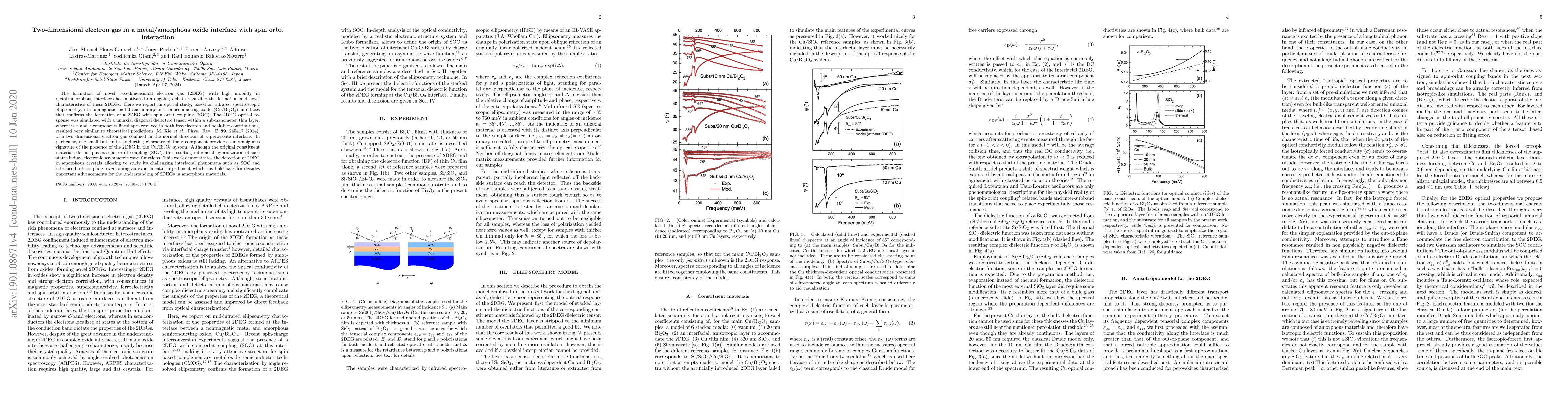This study confirms the formation of a high-mobility two-dimensional electron gas (2DEG) at the interface between Cu and Bi$_2$O$_3$ using infrared spectroscopic ellipsometry, revealing spin-orbit coupling through the optical response. The detected conducting character of the $z$ component provides a signature of the 2DEG, demonstrating the potential for studying interfacial phenomena in amorphous materials.