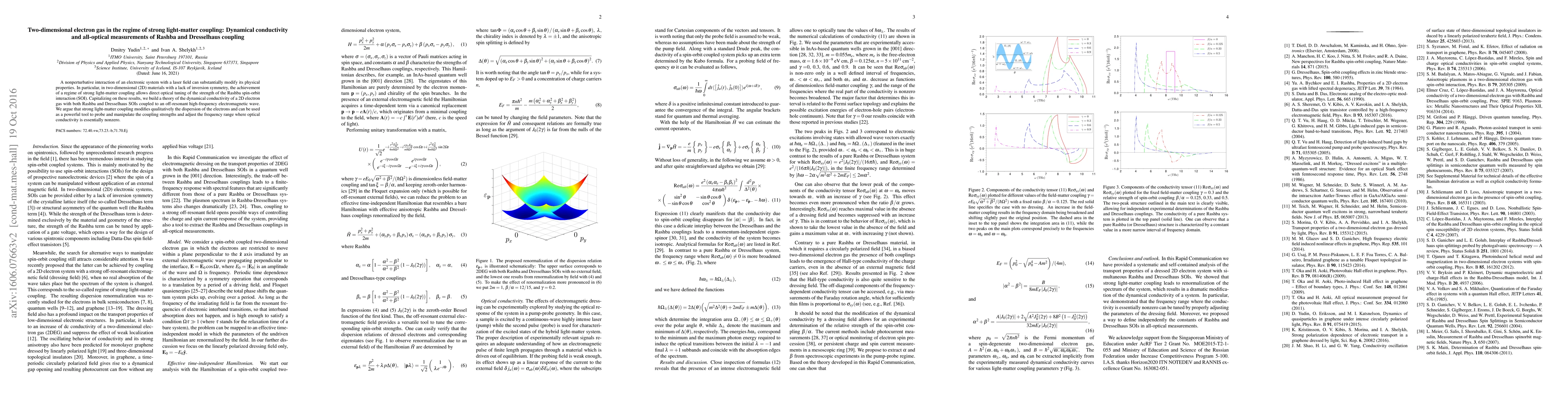 This paper explores the effects of strong light-matter coupling on the dynamical conductivity of two-dimensional electron gases, focusing on the optical tuning of Rashba and Dresselhaus spin-orbit interactions. It proposes that such coupling can significantly alter electron dispersion and offers a method for probing and adjusting optical conductivity.