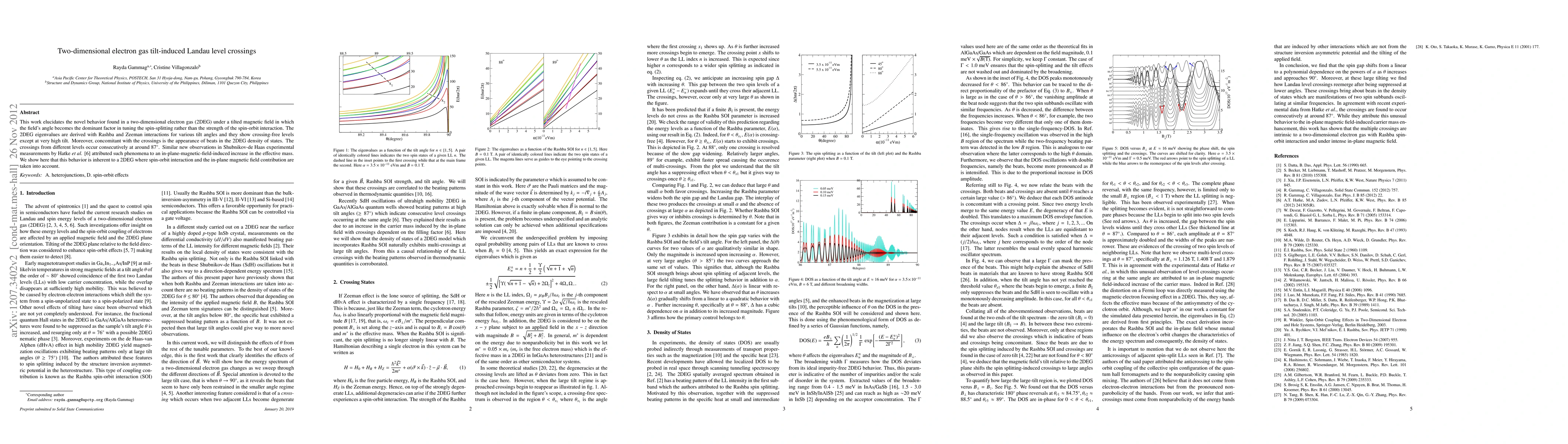 This research investigates the behavior of a two-dimensional electron gas under a tilted magnetic field, revealing that the field's angle, rather than its strength, primarily tunes spin-splitting. The study finds crossing-free Landau levels except at very high tilt angles, accompanied by density of states beats, and confirms these phenomena through theoretical derivations and experimental observations.