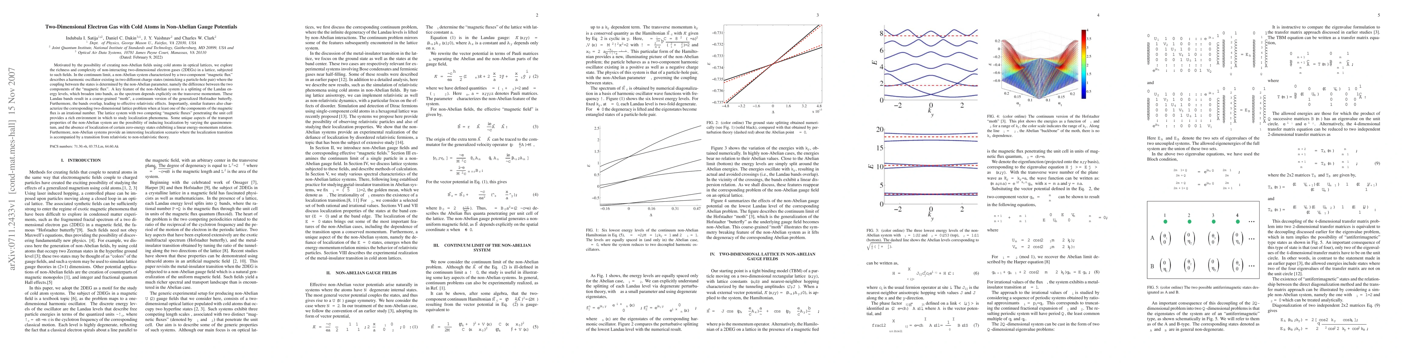 Motivated by the possibility of creating non-Abelian fields using cold atoms in optical lattices, we explore the richness and complexity of non-interacting two-dimensional electron gases (2DEGs) in a lattice, subjected to such fields. In the continuum limit, a non-Abelian system characterized by a two-component "magnetic flux" describes a harmonic oscillator existing in two different charge states (mimicking a particle-hole pair) where the coupling between the states is determined by the non-Abelian parameter, namely the difference between the two components of the "magnetic flux." A key feature of the non-Abelian system is a splitting of the Landau energy levels, which broaden into bands, as the spectrum depends explicitly on the transverse momentum. These Landau bands result in a coarse-grained "moth," a continuum version of the generalized Hofstadter butterfly. Furthermore, the bands overlap, leading to effective relativistic effects. Importantly, similar features also characterize the corresponding two-dimensional lattice problem when at least one of the components of the magnetic flux is an irrational number. The lattice system with two competing "magnetic fluxes" penetrating the unit cell provides a rich environment in which to study localization phenomena. Some unique aspects of the transport properties of the non-Abelian system are the possibility of inducing localization by varying the quasimomentum, and the absence of localization of certain zero-energy states exhibiting a linear energy-momentum relation. Furthermore, non-Abelian systems provide an interesting localization scenario where the localization transition is accompanied by a transition from relativistic to non-relativistic theory.
