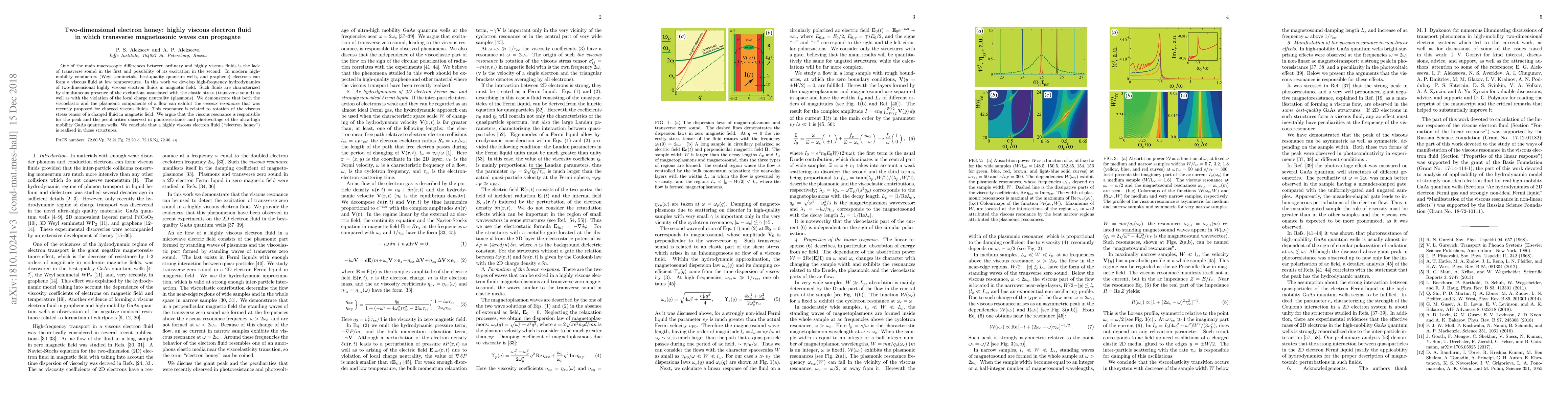 One of the main macroscopic differences between ordinary and highly viscous fluids is the lack of transverse sound in the first and possibility of its excitation in the second. In modern high-mobility conductors (Weyl semimetals, best-quality quantum wells, and graphene) electrons can form a viscous fluid at low temperatures. In this work we develop high-frequency hydrodynamics of two-dimensional highly viscous electron fluids in magnetic field. Such fluids are characterized by simultaneous presence of the excitations associated with the elastic stress (transverse sound) as well as with the violation of the local charge neutrality (plasmons). We demonstrate that both the viscoelastic and the plasmonic components of a flow can exhibit the viscous resonance that was recently proposed for charged viscous fluids. This resonance is related to rotation of the viscous stress tensor of a charged fluid in magnetic field. We argue that the viscous resonance is responsible for the peak and the peculiarities observed in photoresistance and photovoltage of the ultra-high mobility GaAs quantum wells. We conclude that a highly viscous electron fluid ("electron honey") is realized in those structures.