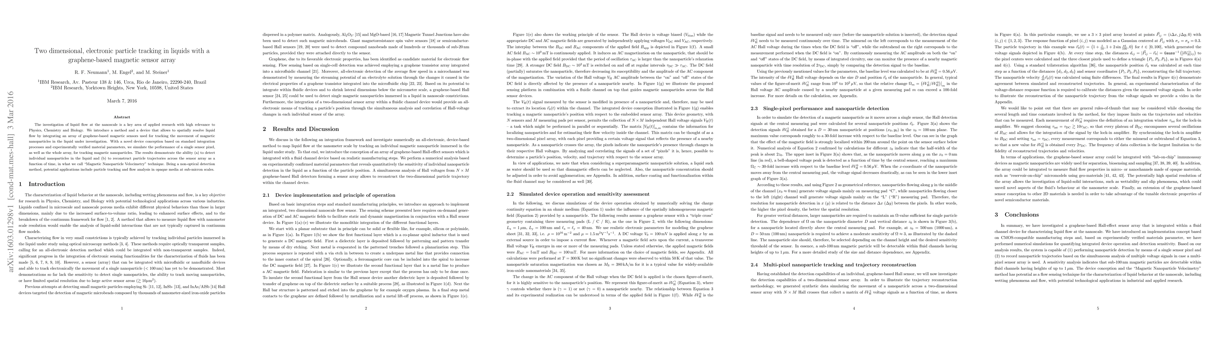 This paper introduces a graphene-based magnetic sensor array for tracking magnetic nanoparticles in liquids, enabling nanoscale liquid flow analysis. The technique, termed "Magnetic Nanoparticle Velocimetry," allows for the detection of individual particles and reconstruction of their trajectories, offering a non-optical method for particle tracking in opaque media.