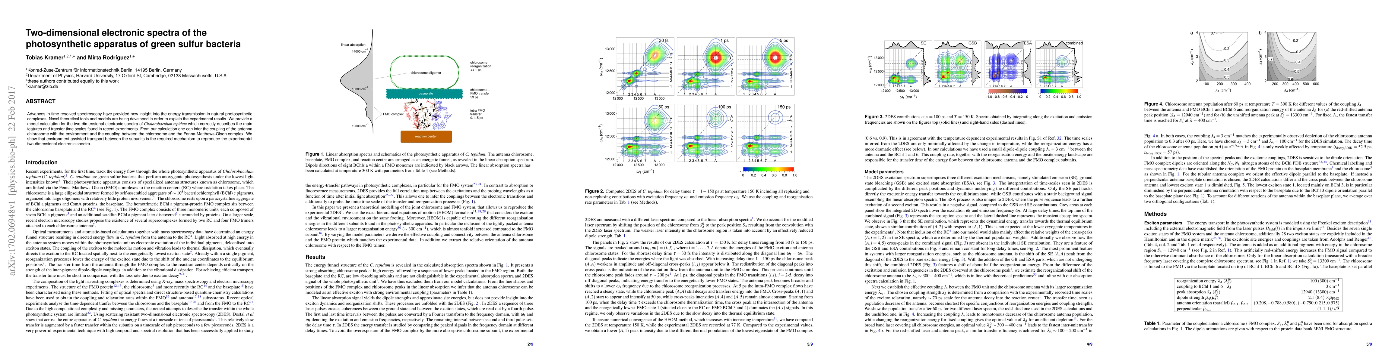 Advances in time resolved spectroscopy have provided new insight into the energy transmission in natural photosynthetic complexes. Novel theoretical tools and models are being developed in order to explain the experimental results. We provide a model calculation for the two-dimensional electronic spectra of Cholorobaculum tepidum which correctly describes the main features and transfer time scales found in recent experiments. From our calculation one can infer the coupling of the antenna chlorosome with the environment and the coupling between the chlorosome and the Fenna-Matthews-Olson complex. We show that environment assisted transport between the subunits is the required mechanism to reproduce the experimental two-dimensional electronic spectra.