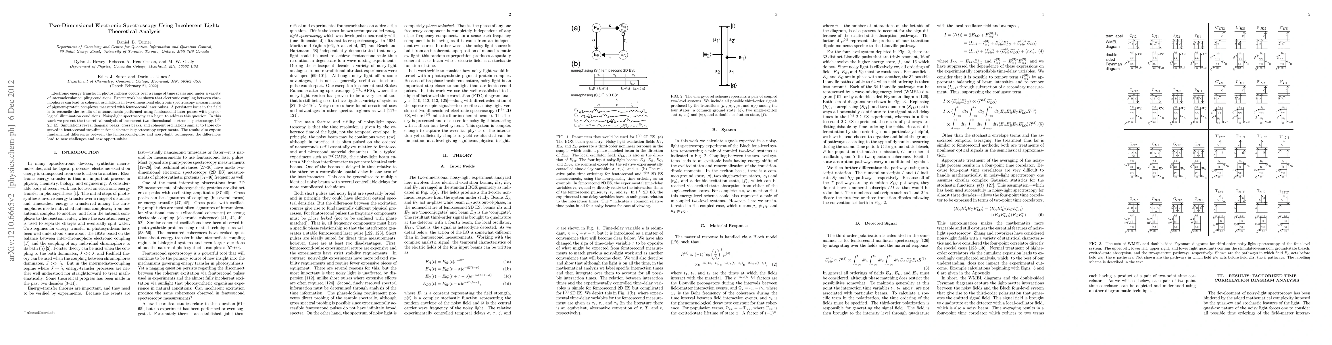 Electronic energy transfer in photosynthesis occurs over a range of time scales and under a variety of intermolecular coupling conditions. Recent work has shown that electronic coupling between chromophores can lead to coherent oscillations in two-dimensional electronic spectroscopy measurements of pigment-protein complexes measured with femtosecond laser pulses. A persistent issue in the field is to reconcile the results of measurements performed using femtosecond laser pulses with physiological illumination conditions. Noisy-light spectroscopy can begin to address this question. In this work we present the theoretical analysis of incoherent two-dimensional electronic spectroscopy, I(4) 2D ES. Simulations reveal diagonal peaks, cross peaks, and coherent oscillations similar to those observed in femtosecond two-dimensional electronic spectroscopy experiments. The results also expose fundamental differences between the femtosecond-pulse and noisy-light techniques; the differences lead to new challenges and new opportunities.