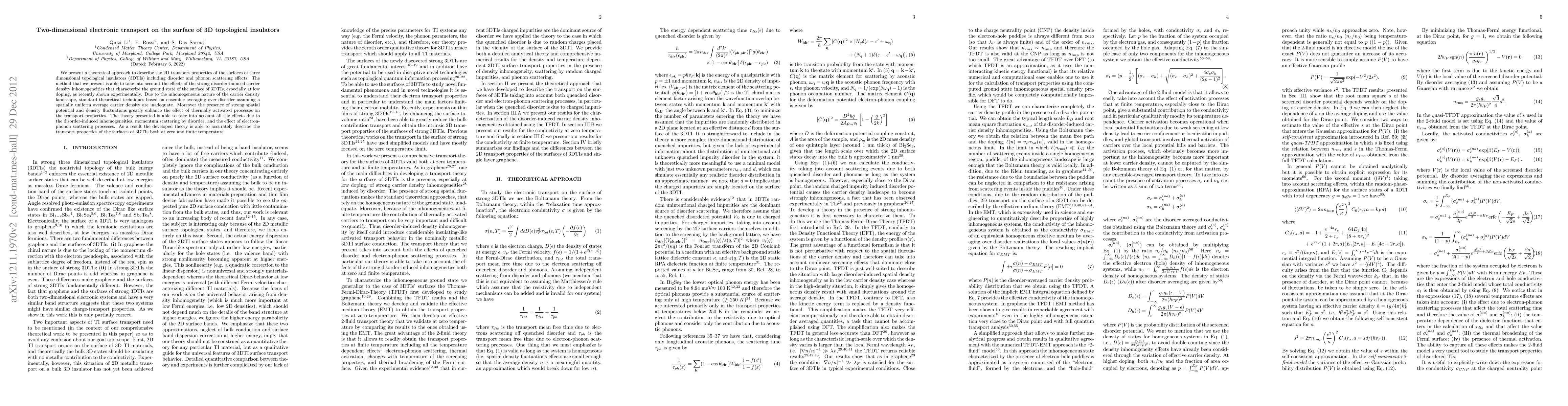 Researchers developed a new theory to describe 2D electronic transport on the surfaces of 3D topological insulators, accounting for disorder and phonon scattering effects. The theory accurately describes the transport properties of these materials at zero and finite temperatures.