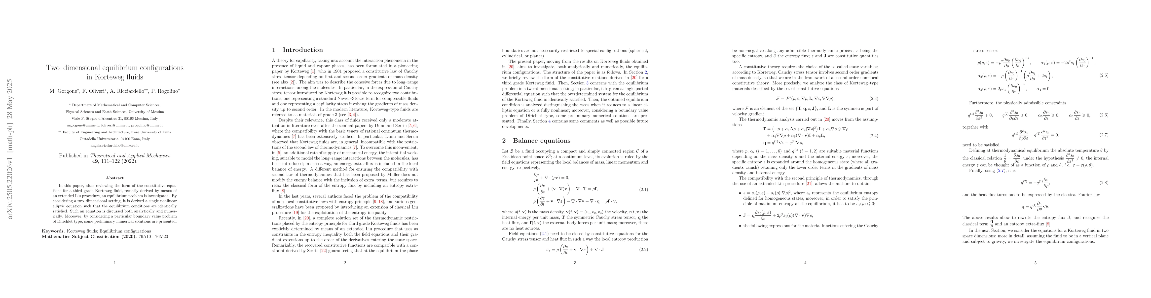 This work extends previous research on Korteweg fluids by focusing on two-dimensional equilibrium configurations and deriving a novel elliptic equation for analysis.