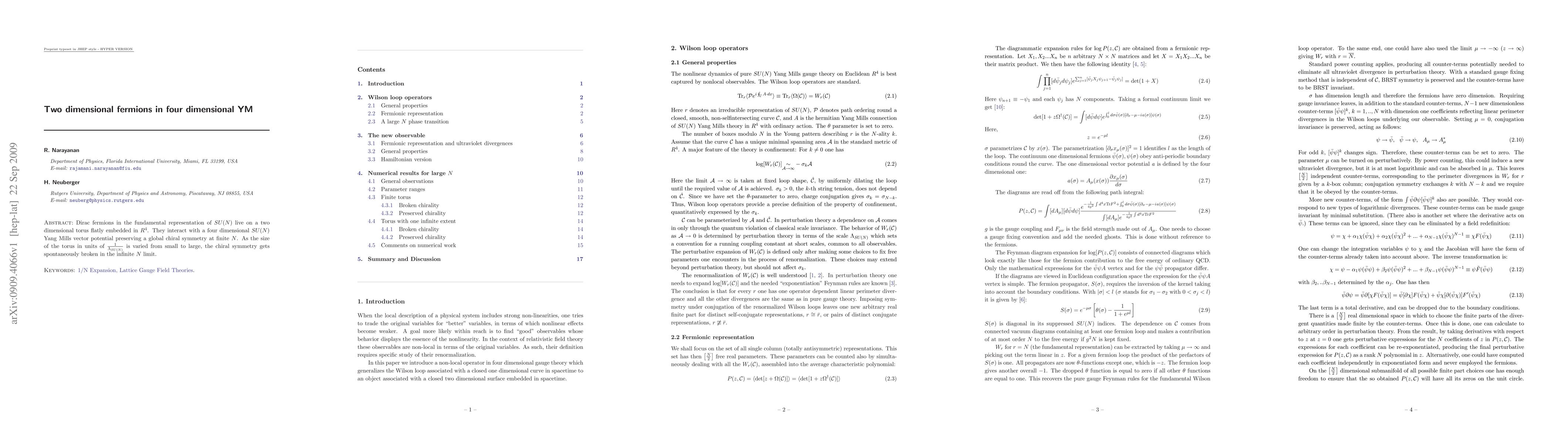 This paper explores the behavior of two-dimensional Dirac fermions in a four-dimensional SU(N) Yang-Mills theory on a torus, revealing spontaneous chiral symmetry breaking as the torus size varies in the large N limit. The study maintains global chiral symmetry at finite N.