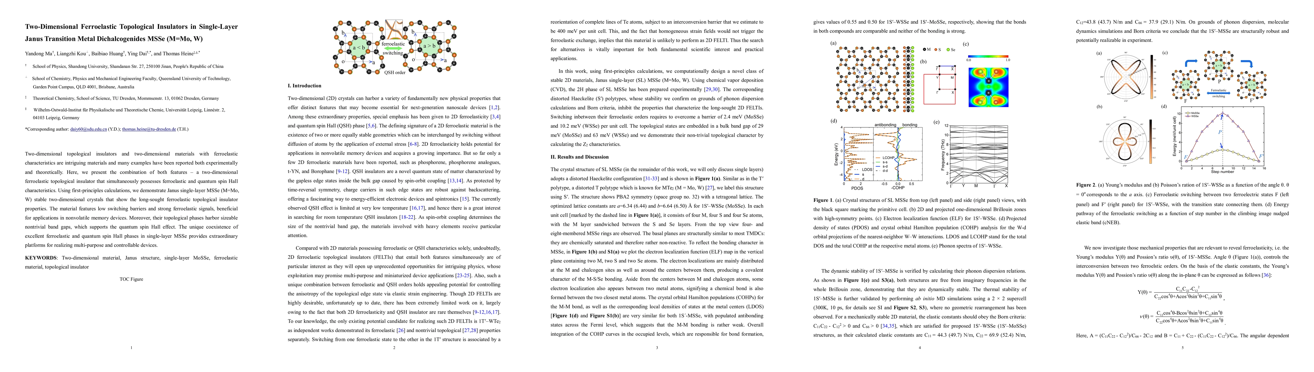 This paper presents first-principles calculations demonstrating that Janus single-layer MSSe (M=Mo, W) are stable two-dimensional ferroelastic topological insulators, exhibiting both low switching barriers and strong ferroelastic signals, alongside sizeable nontrivial band gaps supporting the quantum spin Hall effect. These materials hold promise for multi-functional and controllable nonvolatile memory devices.