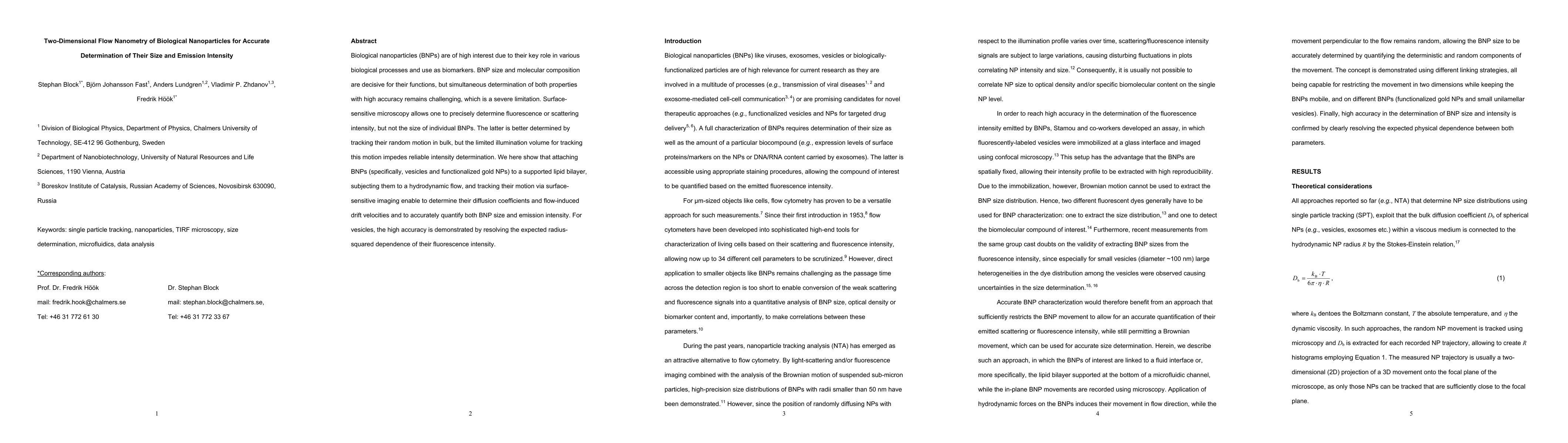 This research introduces a method using two-dimensional flow nanometry to simultaneously determine the size and emission intensity of biological nanoparticles (BNPs) with high accuracy. By attaching BNPs to a supported lipid bilayer and tracking their motion under hydrodynamic flow via surface-sensitive imaging, the study resolves the challenge of separately measuring size and intensity, demonstrating high accuracy for vesicles through the radius-squared dependence of fluorescence intensity.