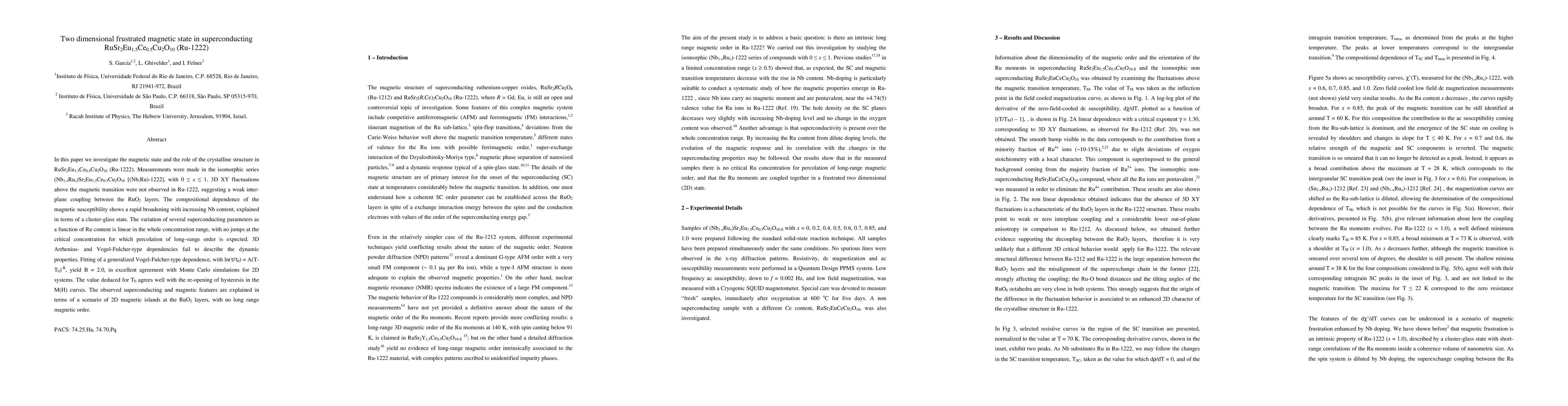 In this paper we investigate the magnetic state and the role of the crystalline structure in RuSr2Eu1.5Ce0.5Cu2O10 (Ru-1222). Measurements were made in the isomorphic series (Nb1-xRux)Sr2Eu1.5Ce0.5Cu2O10 [(Nb,Ru)-1222], with x between 0 and 1. 3D XY fluctuations above the magnetic transition were not observed in Ru-1222, suggesting a weak inter-plane coupling between the RuO2 layers. The compositional dependence of the magnetic susceptibility shows a rapid broadening with increasing Nb content, explained in terms of a cluster-glass state. The variation of several superconducting parameters as a function of Ru content is linear in the whole concentration range, with no jumps at the critical concentration for which percolation of long range order is expected. 3D Arrhenius and Vogel-Fulcher-type dependencies fail to describe the dynamic properties. Fitting of a generalized Vogel-Fulcher-type dependence, with ln(tau/tau0) = A(T-T0)^-B, yield B = 2.0, in excellent agreement with Monte Carlo simulations for 2D systems. The value deduced for T0 agrees well with the re-opening of hysteresis in the M(H) curves. The observed superconducting and magnetic features are explained in terms of a scenario of 2D magnetic islands at the RuO2 layers, with no long range magnetic order.