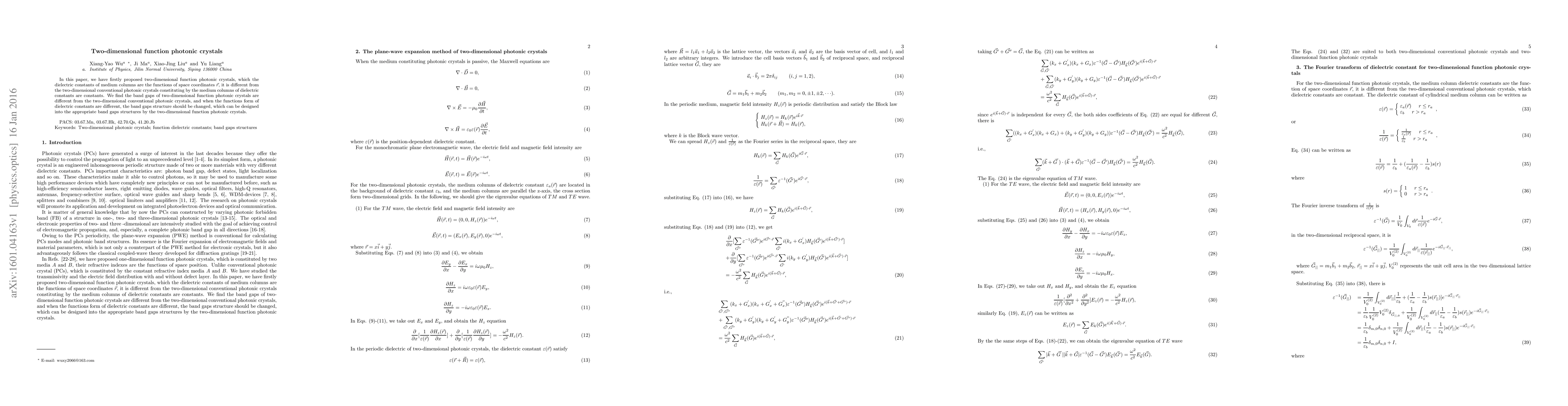 This paper introduces two-dimensional function photonic crystals, where dielectric constants vary with space coordinates, differing from conventional crystals with constant dielectrics. The study reveals that these variable dielectrics lead to distinct band gap structures, enabling tailored design for specific applications.
