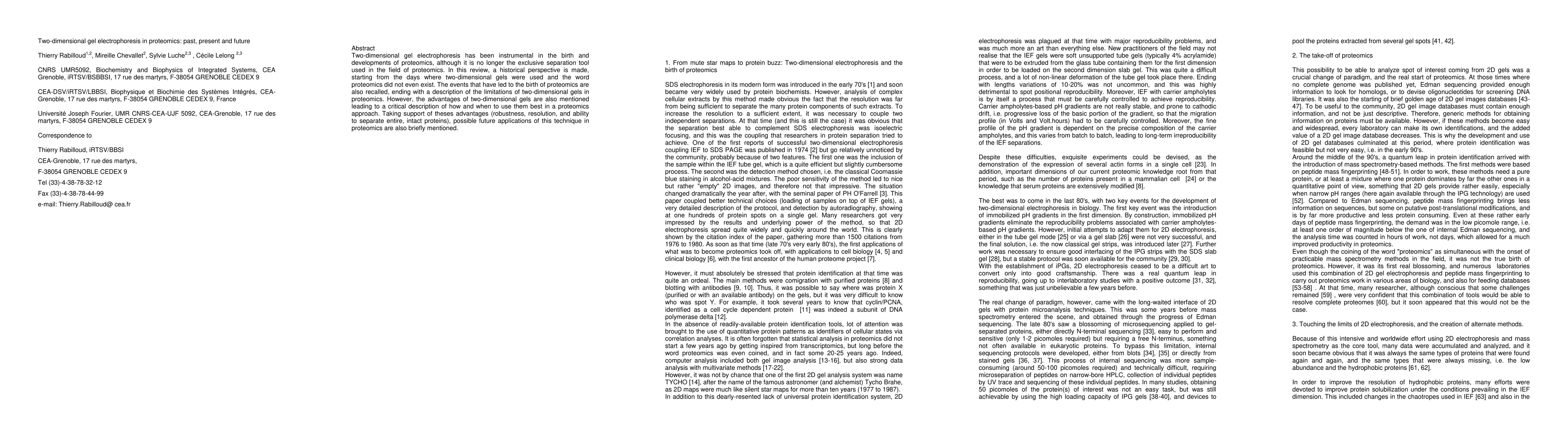 This paper reviews the historical development of two-dimensional gel electrophoresis in proteomics, highlighting its foundational role and current limitations, while emphasizing its advantages like robustness and resolution. It also explores future applications leveraging these strengths.