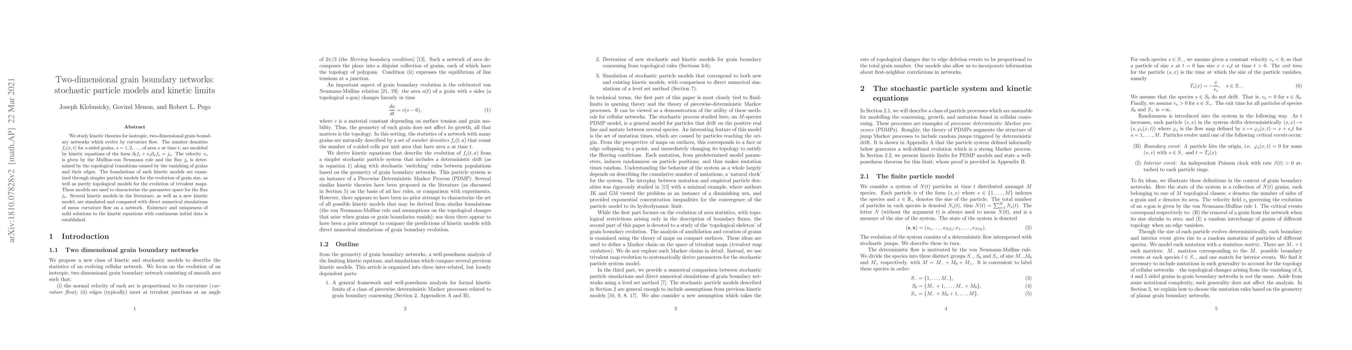 This research paper explores kinetic theories for evolving two-dimensional grain boundary networks via curvature flow. It examines simpler particle and topological models to understand the parameter space for grain transitions, comparing these models with direct simulations. The paper also establishes existence and uniqueness of solutions for the proposed kinetic equations, introducing new models and comparing them with existing ones.