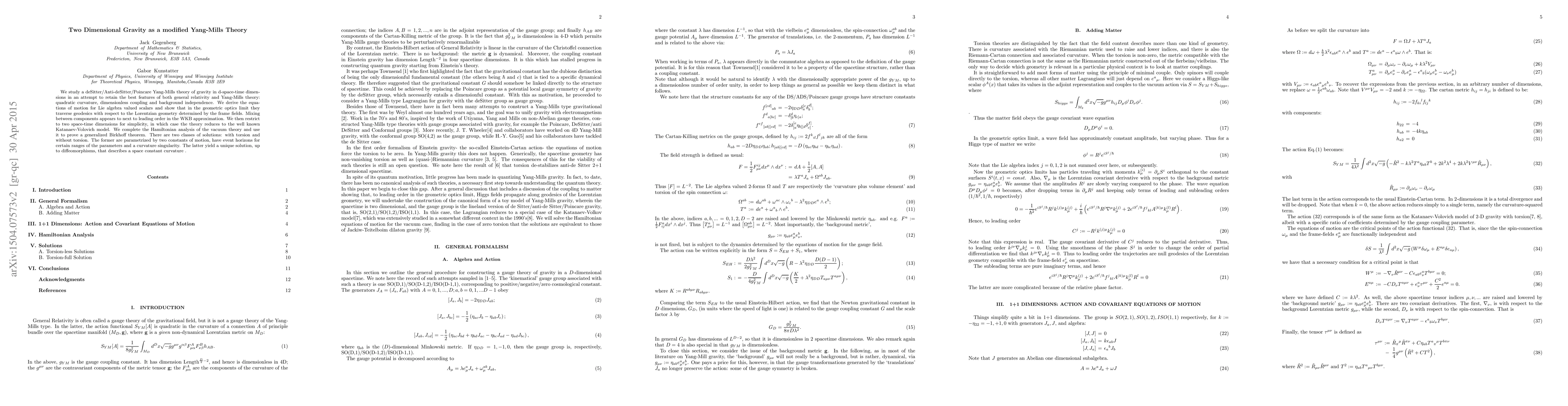 We study a deSitter/Anti-deSitter/Poincare Yang-Mills theory of gravity in d-space-time dimensions in an attempt to retain the best features of both general relativity and Yang-Mills theory: quadratic curvature, dimensionless coupling and background independence. We derive the equations of motion for Lie algebra valued scalars and show that in the geometric optics limit they traverse geodesics with respect to the Lorentzian geometry determined by the frame fields. Mixing between components appears to next to leading order in the WKB approximation. We then restrict to two space-time dimensions for simplicity, in which case the theory reduces to the well known Katanaev-Volovich model. We complete the Hamiltonian analysis of the vacuum theory and use it to prove a generalized Birkhoff theorem. There are two classes of solutions: with torsion and without torsion. The former are parametrized by two constants of motion, have event horizons for certain ranges of the parameters and a curvature singularity. The latter yield a unique solution, up to diffeomorphisms, that describes a space constant curvature .