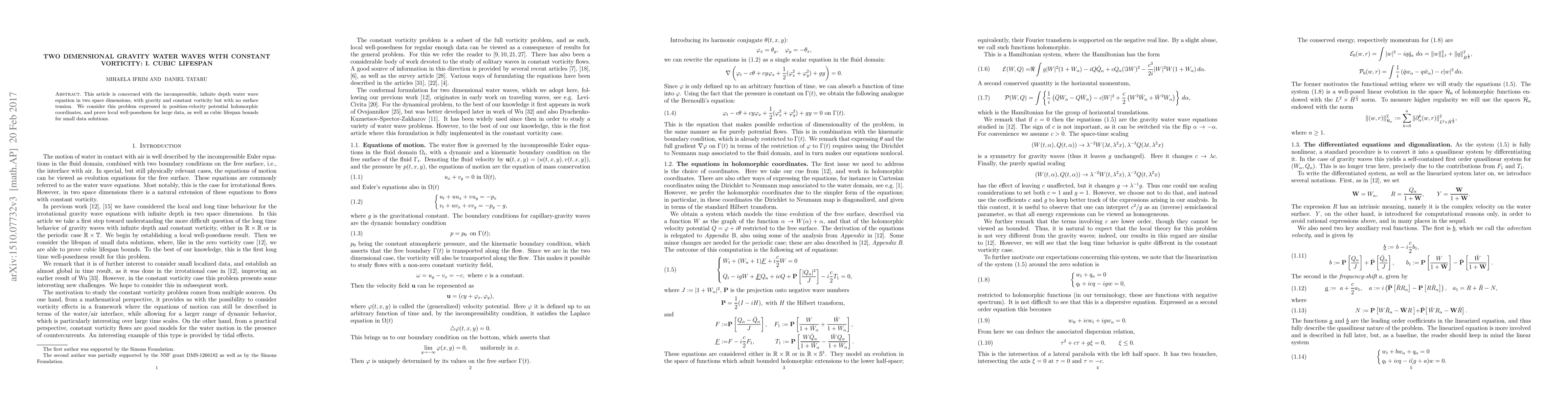 This paper studies the incompressible, infinite depth water wave equation in two dimensions under gravity and constant vorticity, proving local well-posedness for large data and establishing cubic lifespan bounds for small data solutions.