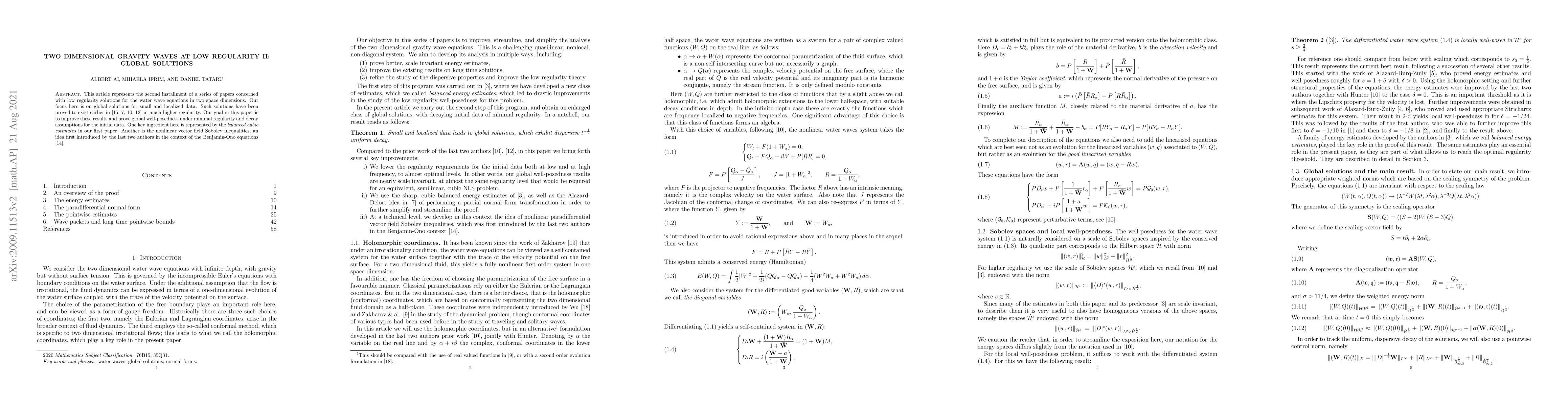 This paper extends the study of low regularity solutions for two-dimensional gravity waves, proving global well-posedness under minimal assumptions for initial data. It builds on balanced cubic estimates and nonlinear vector field Sobolev inequalities to achieve results beyond those established in higher regularity scenarios.