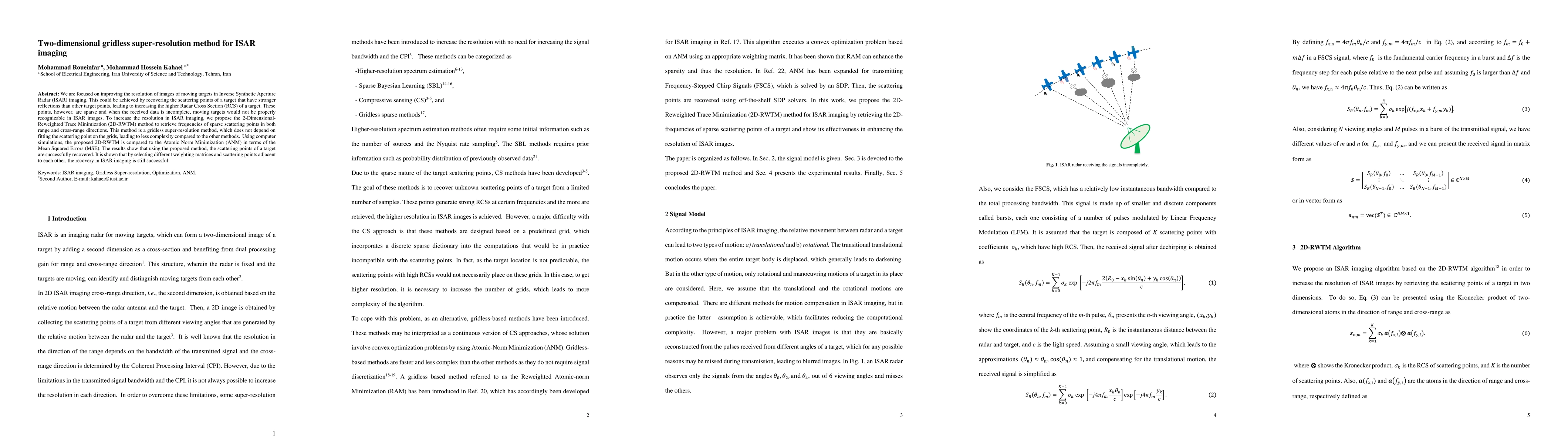 We are focused on improving the resolution of images of moving targets in Inverse Synthetic Aperture Radar (ISAR) imaging. This could be achieved by recovering the scattering points of a target that have stronger reflections than other target points, leading to increasing the higher Radar Cross Section (RCS) of a target. These points, however, are sparse and when the received data is incomplete, moving targets would not be properly recognizable in ISAR images. To increase the resolution in ISAR imaging, we propose the 2-Dimensional Reweighted Trace Minimization (2D-RWTM) method to retrieve frequencies of sparse scattering points in both range and cross-range directions. This method is a gridless super-resolution method, which does not depend on fitting the scattering point on the grids, leading to less complexity compared to the other methods. Using computer simulations, the proposed 2D-RWTM is compared to the Atomic Norm Minimization (ANM) in terms of the Mean Squared Errors (MSE). The results show that using the proposed method, the scattering points of a target are successfully recovered. It is shown that by selecting different weighting matrices and scattering points adjacent to each other, the recovery in ISAR imaging is still successful.