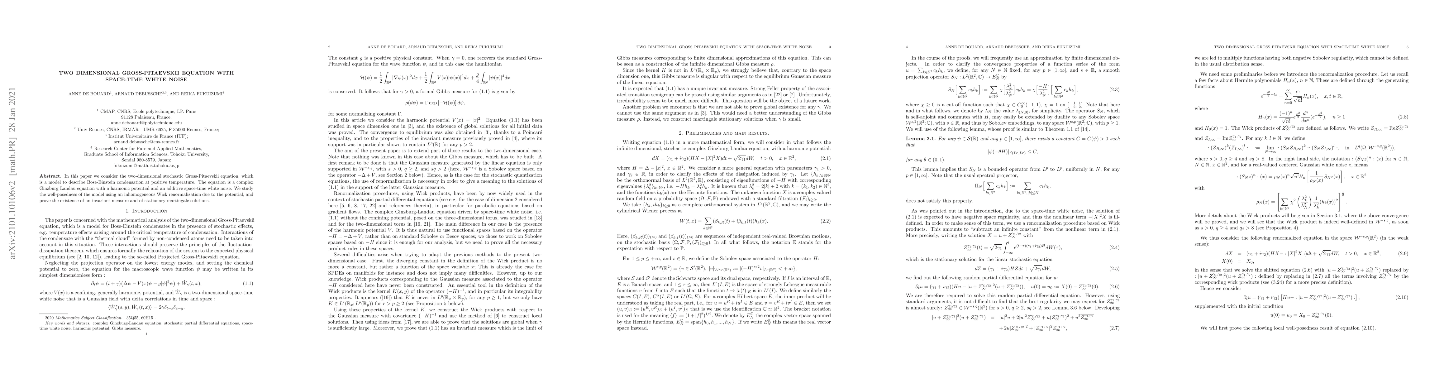 This paper investigates the two-dimensional stochastic Gross-Pitaevskii equation, modeling Bose-Einstein condensation, incorporating space-time white noise. It establishes well-posedness via inhomogeneous Wick renormalization and proves the existence of an invariant measure and stationary martingale solutions.