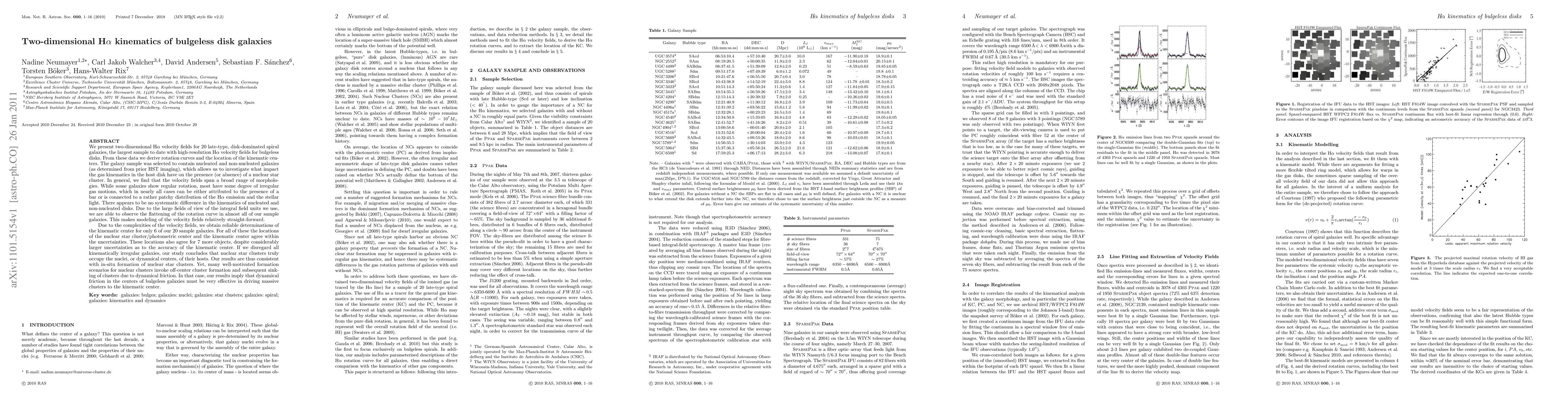 We present two-dimensional H_alpha velocity fields for 20 late-type, disk-dominated spiral galaxies, the largest sample to date with high-resolution H_alpha velocity fields for bulgeless disks. From these data we derive rotation curves and the location of the kinematic centers. The galaxy sample was selected to contain nucleated and non-nucleated galaxies, which allows us to investigate what impact the gas kinematics in the host disk have on the presence (or absence) of a nuclear star cluster. In general, we find that the velocity fields span a broad range of morphologies. While some galaxies show regular rotation, most have some degree of irregular gas motions. There appears to be no systematic difference in the kinematics of nucleated and non-nucleated disks. Due to the large fields of view of the integral field units we use, we are able to observe the flattening of the rotation curve in almost all of our sample galaxies. This makes modeling of the velocity fields relatively straight-forward. Due to the complexities of the velocity fields, we obtain reliable determinations of the kinematic center for only 6 of our 20 sample galaxies. For all of these the locations of the nuclear star cluster/photometric center and the kinematic center agree within the uncertainties. If we disregard all kinematically irregular galaxies, our study concludes that nuclear star clusters truly occupy the nuclei, or dynamical centers, of their hosts. Our results are thus consistent with in-situ formation of nuclear star clusters. Yet, many well-motivated formation scenarios for nuclear clusters invoke off-center cluster formation and subsequent sinking of clusters due to dynamical friction. In that case, our results imply that dynamical friction in the centers of bulgeless galaxies must be very effective in driving massive clusters to the kinematic center. (abridged)