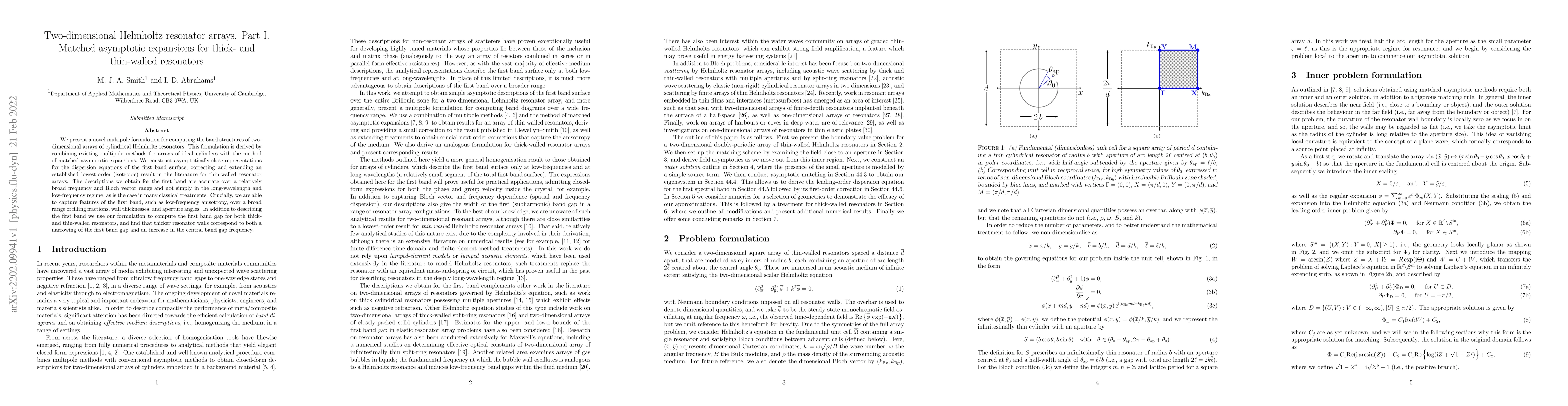 We present a novel multipole formulation for computing the band structures of two-dimensional arrays of cylindrical Helmholtz resonators. This formulation is derived by combining existing multipole methods for arrays of ideal cylinders with the method of matched asymptotic expansions. We construct asymptotically close representations for the dispersion equations of the first band surface, correcting and extending an established lowest-order (isotropic) result in the literature for thin-walled resonator arrays. The descriptions we obtain for the first band are accurate over a relatively broad frequency and Bloch vector range and not simply in the long-wavelength and low-frequency regime, as is the case in many classical treatments. Crucially, we are able to capture features of the first band, such as low-frequency anisotropy, over a broad range of filling fractions, wall thicknesses, and aperture angles. In addition to describing the first band we use our formulation to compute the first band gap for both thick- and thin-walled resonators, and find that thicker resonator walls correspond to both a narrowing of the first band gap and an increase in the central band gap frequency.